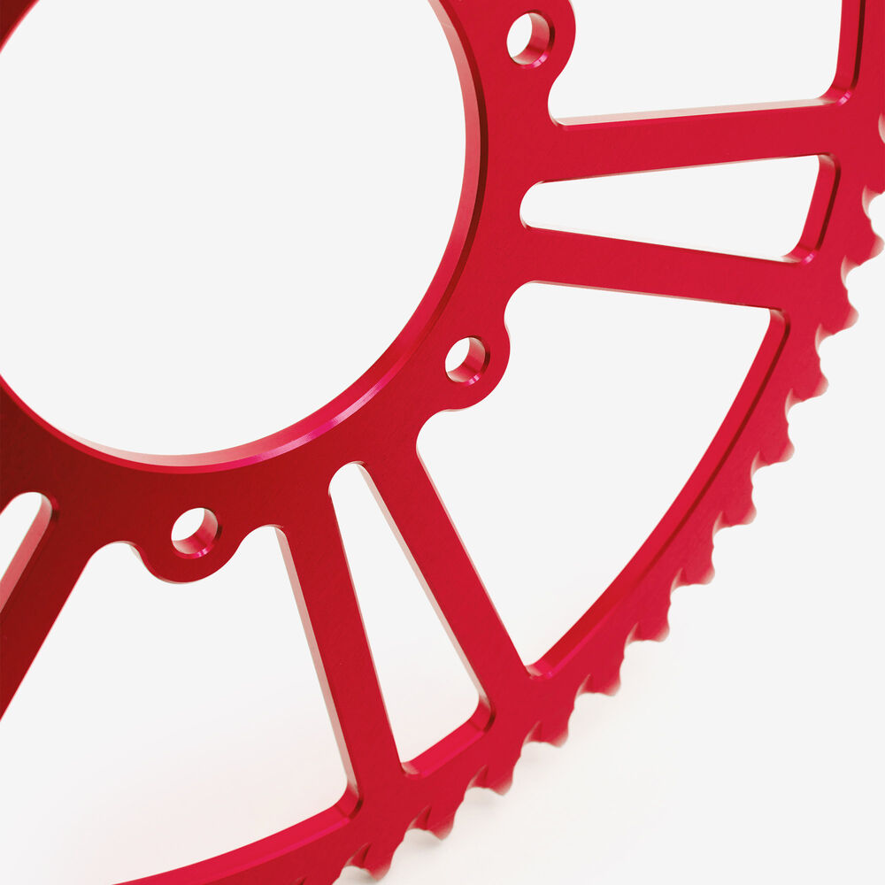 Choose from sprocket sizes ranging from 44T to 60T, providing you with a variety of options to customize your ride. Additionally, our sprockets come in eight vibrant colors, allowing you to make a bold statement while optimizing your bikes performance.