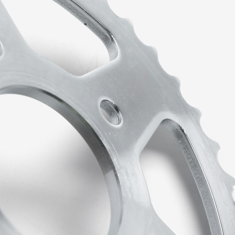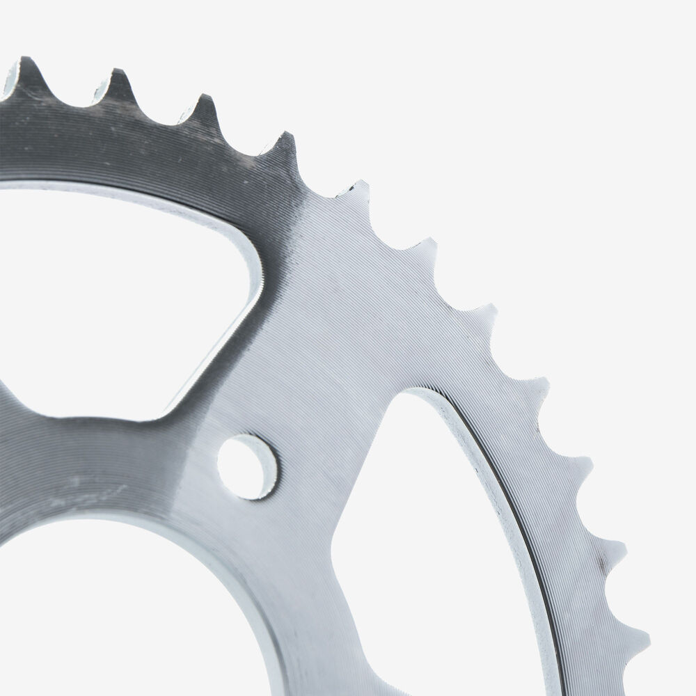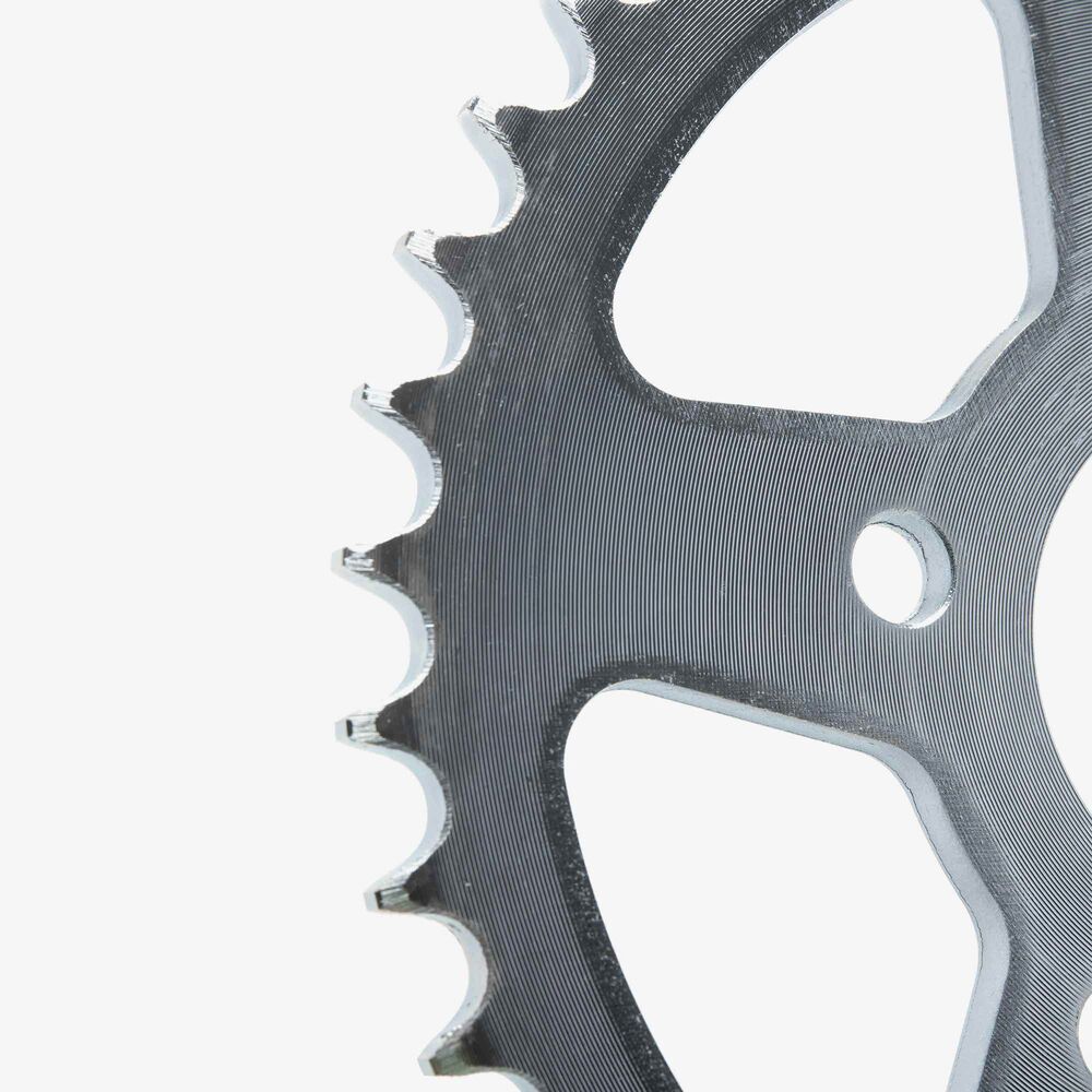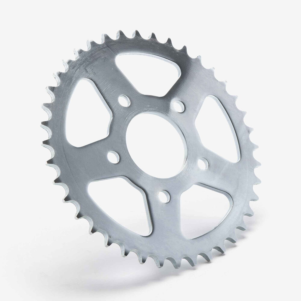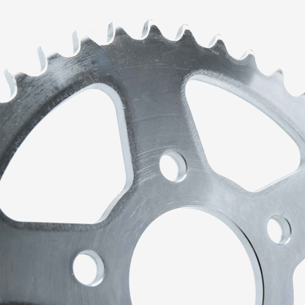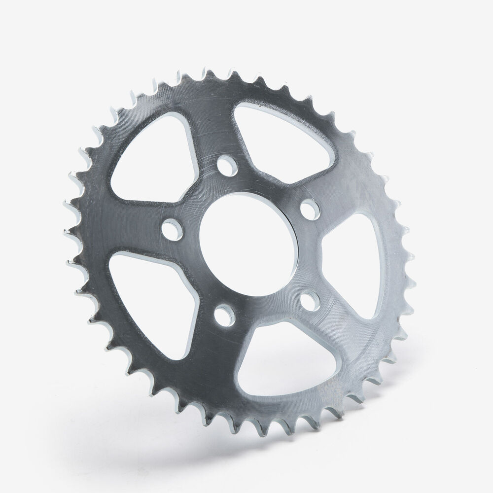 The rear sprocket on a motorcycle is a key component of the drivetrain system, located on the rear wheel hub. It works in conjunction with the front sprocket and the chain to transmit power from the engine to the rear wheel, propelling the motorcycle forward. The rear sprocket features a series of teeth that mesh with the chain, and its size affects the motorcycle’s gearing and performance characteristics. A larger rear sprocket increases torque and acceleration, while a smaller one improves top speed and fuel efficiency. Proper maintenance and alignment of the rear sprocket are essential for optimal drivetrain performance and safety.