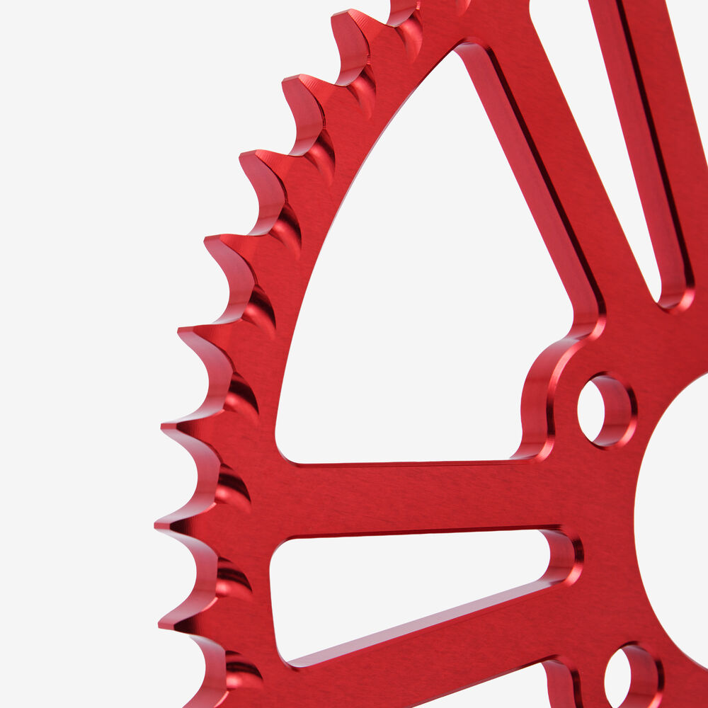 The rear sprocket on a motorcycle is a key component of the drivetrain system, located on the rear wheel hub. It works in conjunction with the front sprocket and the chain to transmit power from the engine to the rear wheel, propelling the motorcycle forward. The rear sprocket features a series of teeth that mesh with the chain, and its size affects the motorcycle’s gearing and performance characteristics. A larger rear sprocket increases torque and acceleration, while a smaller one improves top speed and fuel efficiency. Proper maintenance and alignment of the rear sprocket are essential for optimal drivetrain performance and safety.