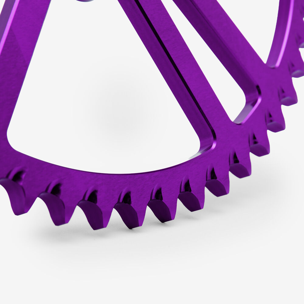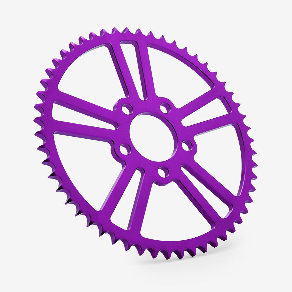 The rear sprocket on a motorcycle is a key component of the drivetrain system, located on the rear wheel hub. It works in conjunction with the front sprocket and the chain to transmit power from the engine to the rear wheel, propelling the motorcycle forward. The rear sprocket features a series of teeth that mesh with the chain, and its size affects the motorcycle’s gearing and performance characteristics. A larger rear sprocket increases torque and acceleration, while a smaller one improves top speed and fuel efficiency. Proper maintenance and alignment of the rear sprocket are essential for optimal drivetrain performance and safety.