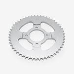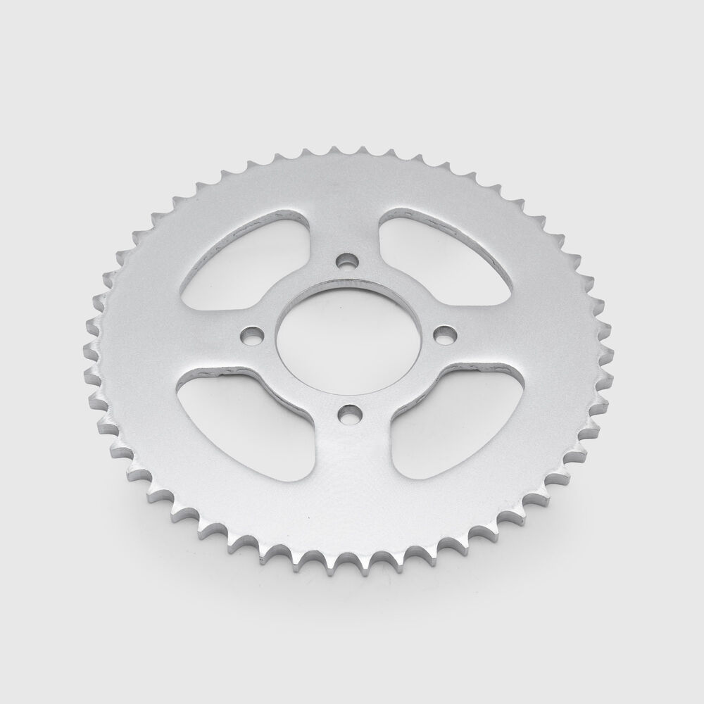 The rear sprocket on a motorcycle is a key component of the drivetrain system, located on the rear wheel hub. It works in conjunction with the front sprocket and the chain to transmit power from the engine to the rear wheel, propelling the motorcycle forward. The rear sprocket features a series of teeth that mesh with the chain, and its size affects the motorcycle’s gearing and performance characteristics. A larger rear sprocket increases torque and acceleration, while a smaller one improves top speed and fuel efficiency. Proper maintenance and alignment of the rear sprocket are essential for optimal drivetrain performance and safety.