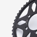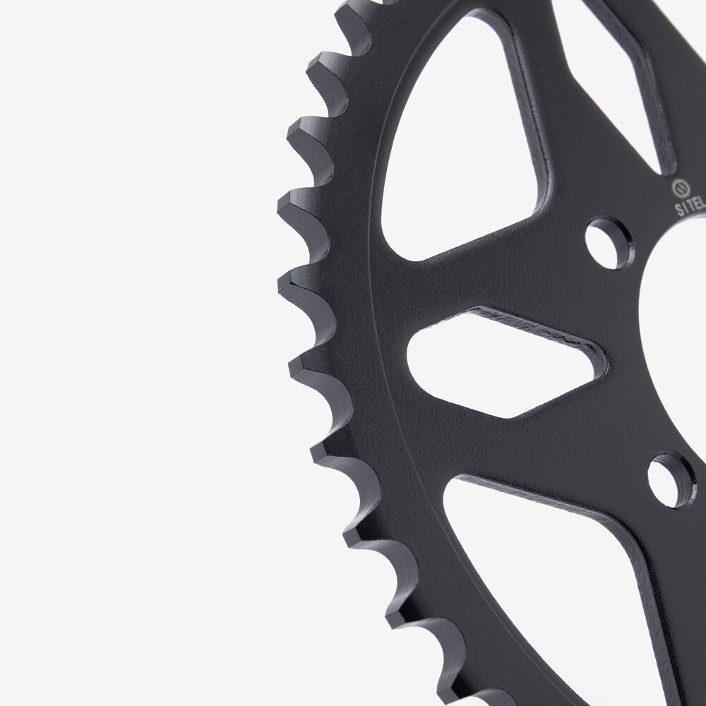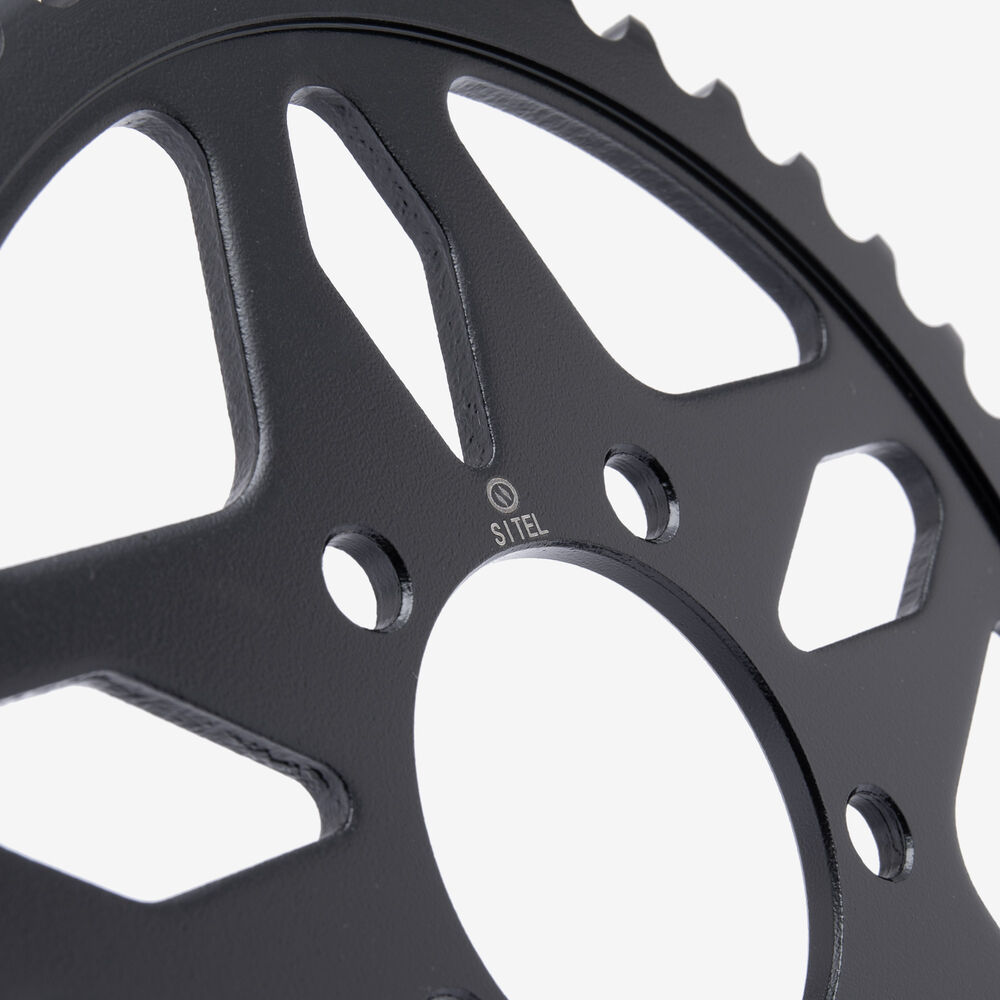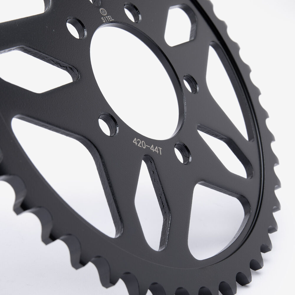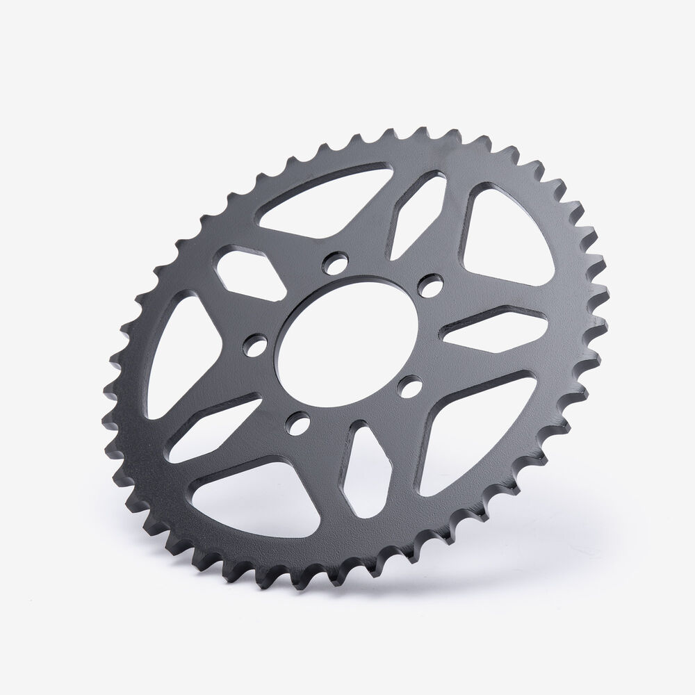 The rear sprocket on a motorcycle is a key component of the drivetrain system, located on the rear wheel hub. It works in conjunction with the front sprocket and the chain to transmit power from the engine to the rear wheel, propelling the motorcycle forward. The rear sprocket features a series of teeth that mesh with the chain, and its size affects the motorcycle’s gearing and performance characteristics. A larger rear sprocket increases torque and acceleration, while a smaller one improves top speed and fuel efficiency. Proper maintenance and alignment of the rear sprocket are essential for optimal drivetrain performance and safety.
