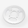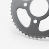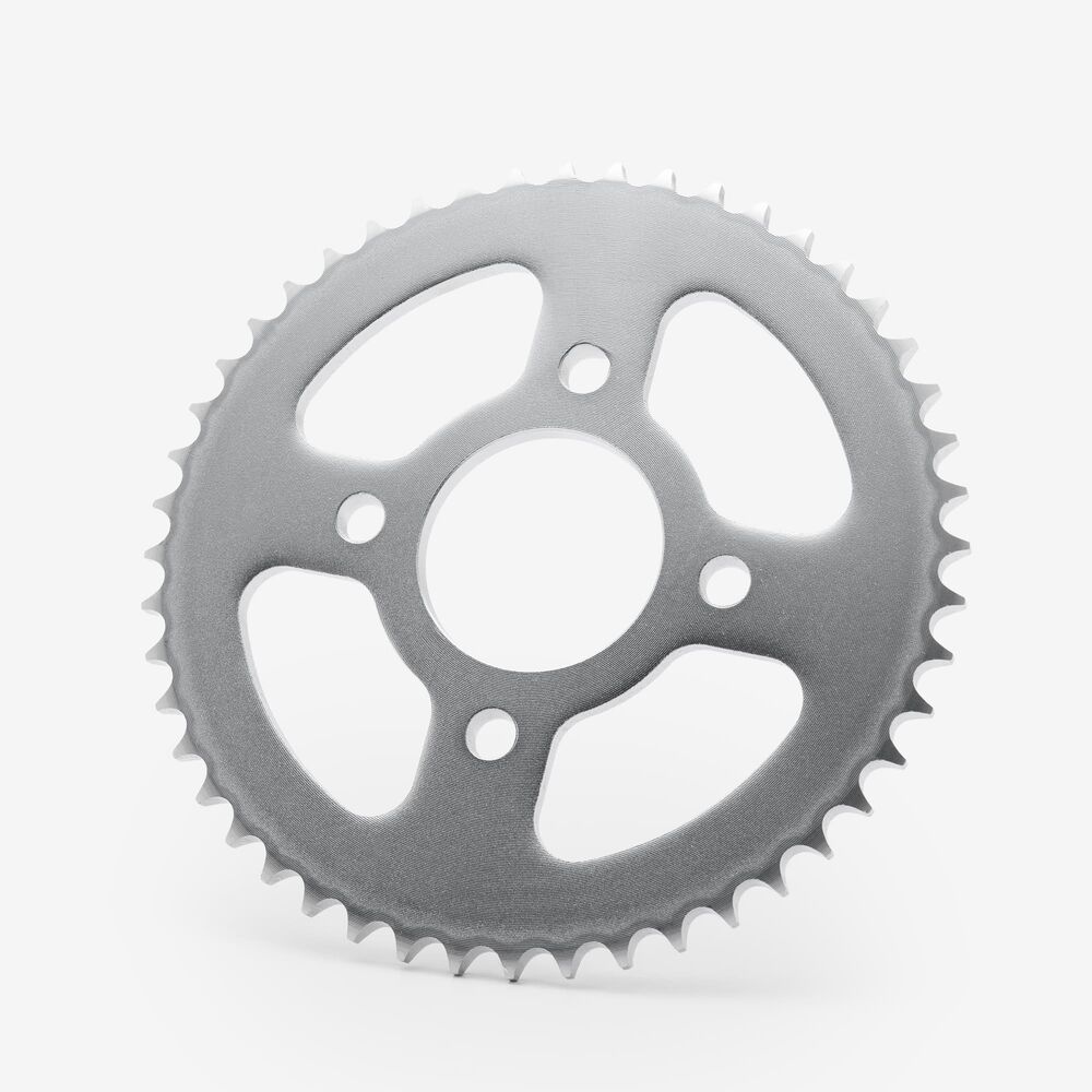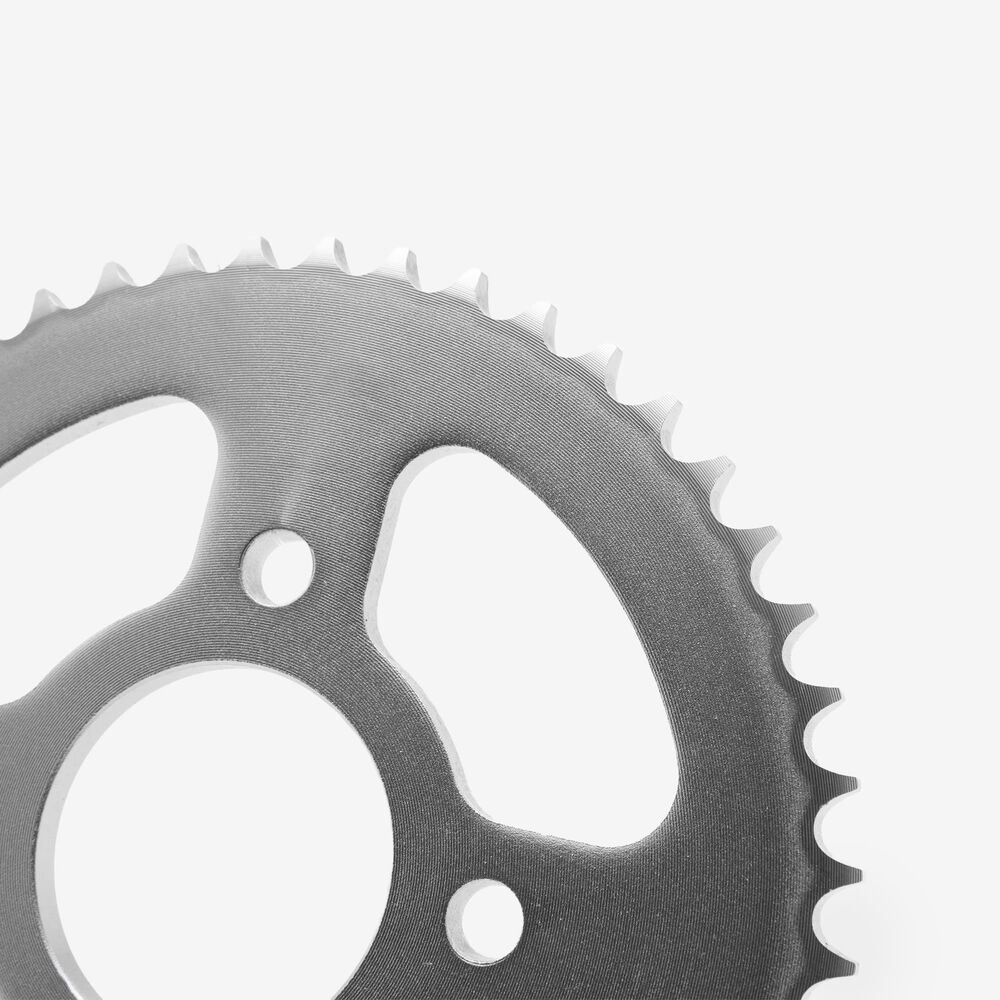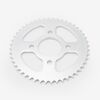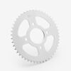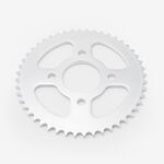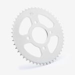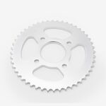 The rear sprocket on a motorcycle is a key component of the drivetrain system, located on the rear wheel hub. It works in conjunction with the front sprocket and the chain to transmit power from the engine to the rear wheel, propelling the motorcycle forward. The rear sprocket features a series of teeth that mesh with the chain, and its size affects the motorcycle’s gearing and performance characteristics. A larger rear sprocket increases torque and acceleration, while a smaller one improves top speed and fuel efficiency. Proper maintenance and alignment of the rear sprocket are essential for optimal drivetrain performance and safety.