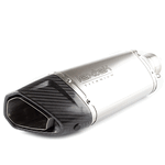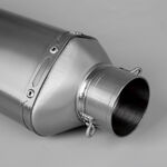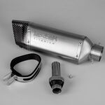 This is a spring mounted silencer , springs are not supplied, for available springs search SPNG150 This product does not meet the relevant noise or emission requirements for street or highway use. The baffle which comes with this silencer must be secured with a lock washer or temporary threadlock to ensure it is held securely in place.