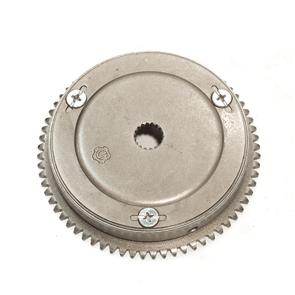 The starter clutch, also known as the one-way clutch or starter drive, is a component in a motorcycle's starting system that allows the starter motor to crank the engine and then disengages once the engine starts. It consists of a set of gears or rollers that engage with the engine's flywheel or crankshaft to turn the engine over. Once the engine starts and reaches a certain speed, the starter clutch disengages to prevent the starter motor from turning with the engine. This component ensures smooth engine start-up and prevents potential damage to the starter motor.
