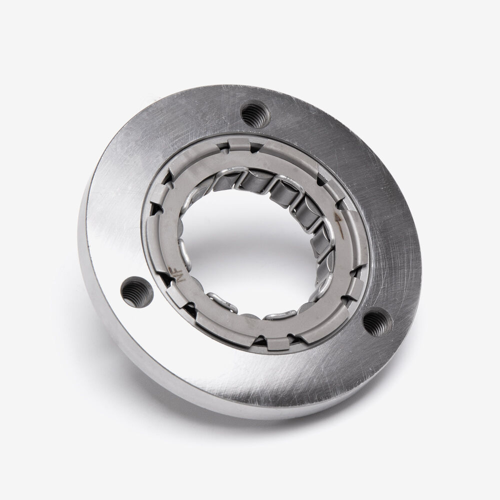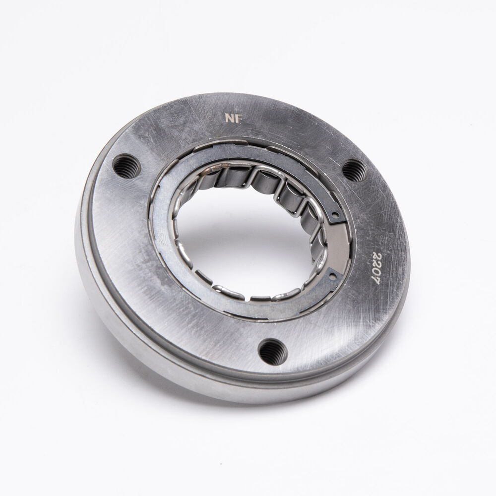 The starter clutch, also known as the one-way clutch or starter drive, is a component in a motorcycle's starting system that allows the starter motor to crank the engine and then disengages once the engine starts. It consists of a set of gears or rollers that engage with the engine's flywheel or crankshaft to turn the engine over. Once the engine starts and reaches a certain speed, the starter clutch disengages to prevent the starter motor from turning with the engine. This component ensures smooth engine start-up and prevents potential damage to the starter motor.