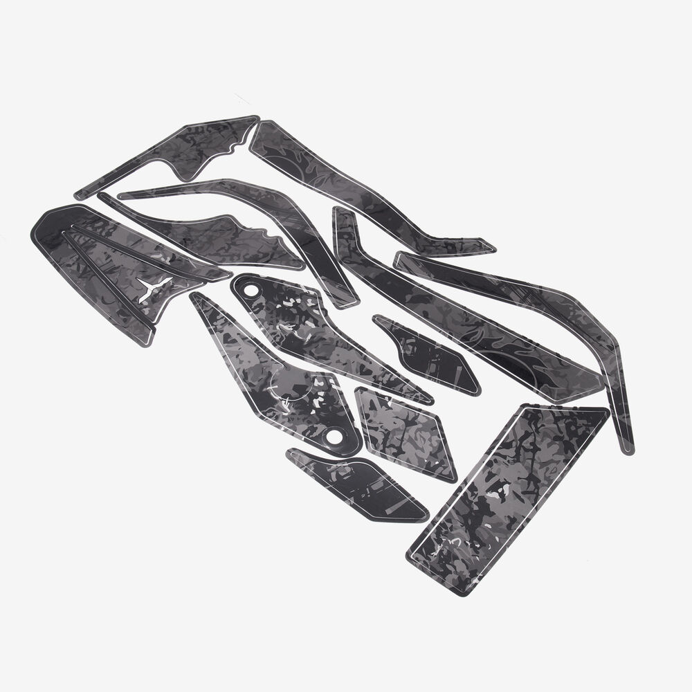 Stickers and decals for motorcycles are adhesive graphics used to customize and decorate the bike's surface. They come in various designs, colors, and patterns, allowing riders to personalize their motorcycles and enhance their visual appeal. Stickers and decals are typically made from durable vinyl or other weather-resistant materials, ensuring they withstand exposure to the elements. They can be applied to various parts of the motorcycle, including the tank, fenders, and fairings, and are easily removable without damaging the underlying surface.
