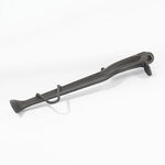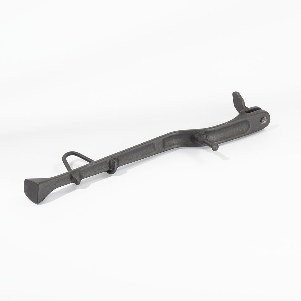 The side stand, also known as the kickstand, is a support mechanism on a motorcycle that allows it to remain upright when parked. It is typically mounted on the left side of the motorcycle and extends downward to rest on the ground. When deployed, the side stand stabilizes the motorcycle by providing a solid base, preventing it from tipping over. The stand is often equipped with a spring mechanism that automatically retracts it when the motorcycle is in use, and may include a safety switch to prevent engine start if the stand is down.