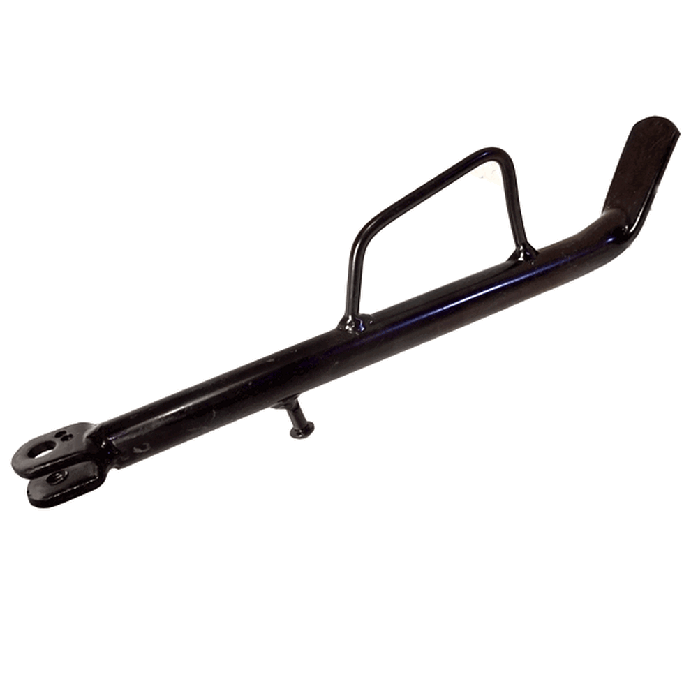 The side stand, also known as the kickstand, is a support mechanism on a motorcycle that allows it to remain upright when parked. It is typically mounted on the left side of the motorcycle and extends downward to rest on the ground. When deployed, the side stand stabilizes the motorcycle by providing a solid base, preventing it from tipping over. The stand is often equipped with a spring mechanism that automatically retracts it when the motorcycle is in use, and may include a safety switch to prevent engine start if the stand is down.