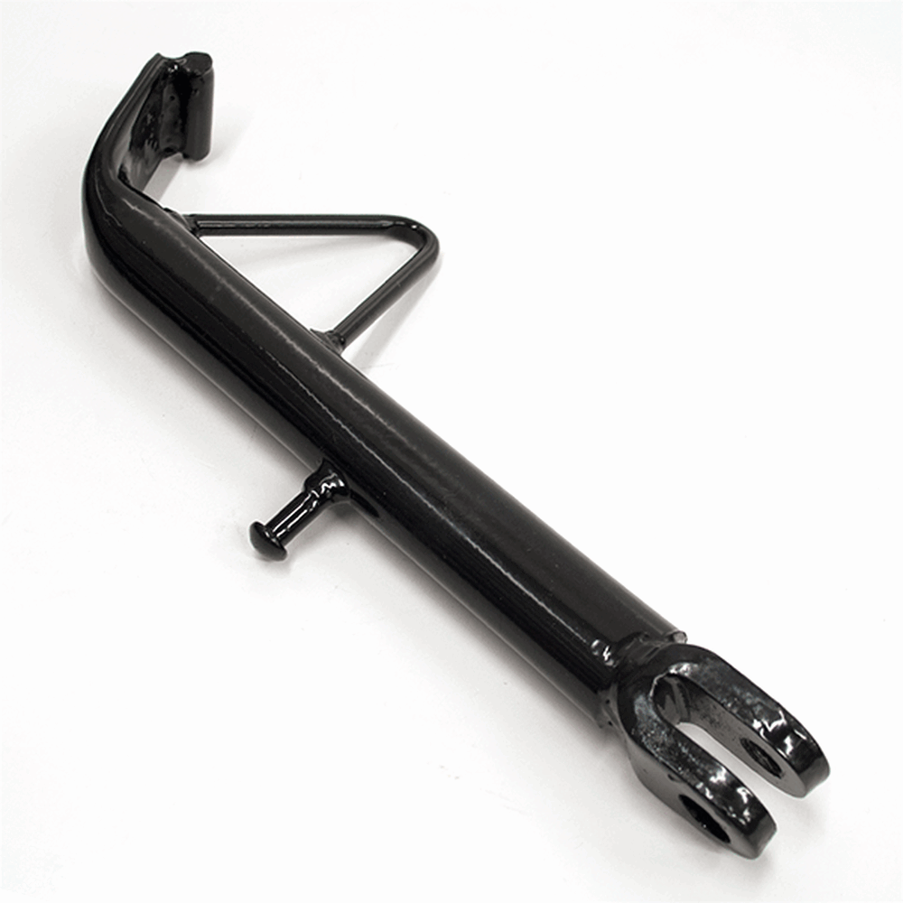 The side stand, also known as the kickstand, is a support mechanism on a motorcycle that allows it to remain upright when parked. It is typically mounted on the left side of the motorcycle and extends downward to rest on the ground. When deployed, the side stand stabilizes the motorcycle by providing a solid base, preventing it from tipping over. The stand is often equipped with a spring mechanism that automatically retracts it when the motorcycle is in use, and may include a safety switch to prevent engine start if the stand is down.