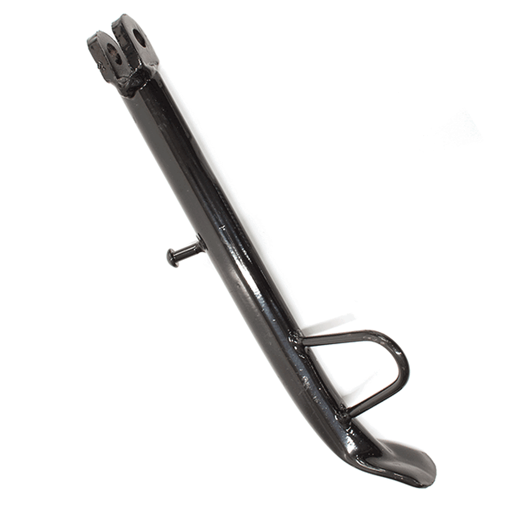 The side stand, also known as the kickstand, is a support mechanism on a motorcycle that allows it to remain upright when parked. It is typically mounted on the left side of the motorcycle and extends downward to rest on the ground. When deployed, the side stand stabilizes the motorcycle by providing a solid base, preventing it from tipping over. The stand is often equipped with a spring mechanism that automatically retracts it when the motorcycle is in use, and may include a safety switch to prevent engine start if the stand is down.