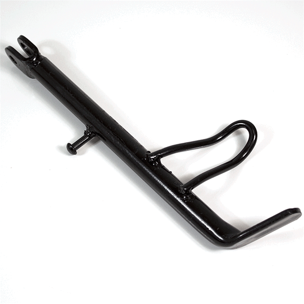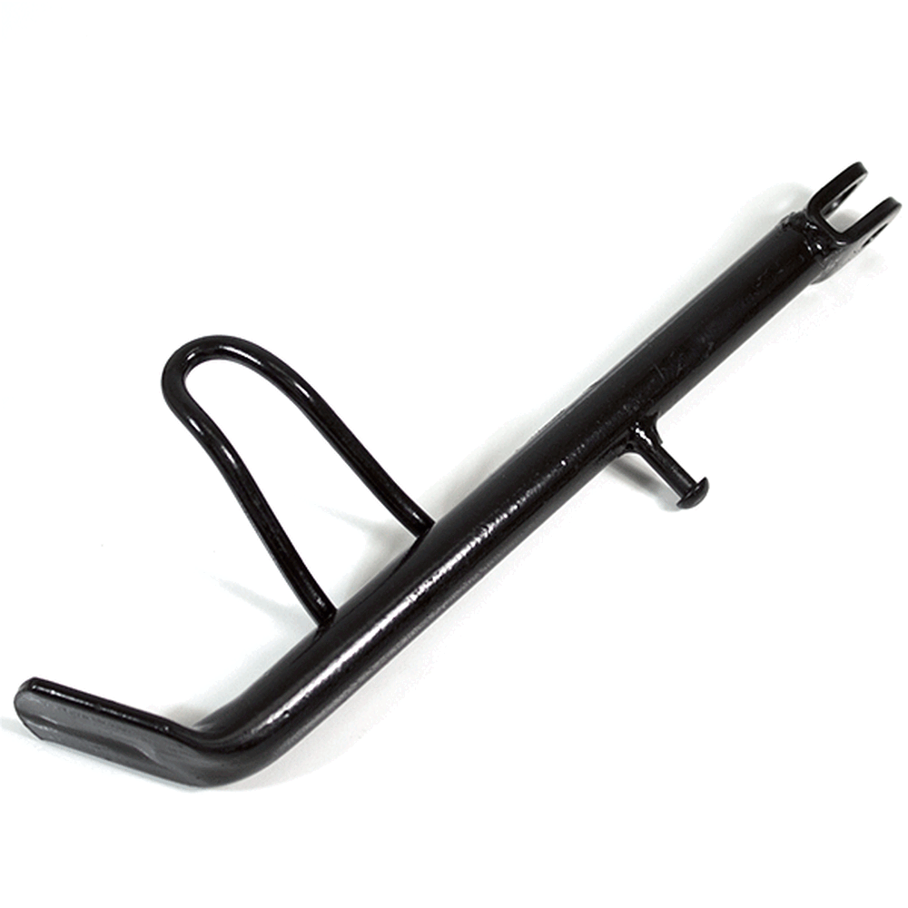 The side stand, also known as the kickstand, is a support mechanism on a motorcycle that allows it to remain upright when parked. It is typically mounted on the left side of the motorcycle and extends downward to rest on the ground. When deployed, the side stand stabilizes the motorcycle by providing a solid base, preventing it from tipping over. The stand is often equipped with a spring mechanism that automatically retracts it when the motorcycle is in use, and may include a safety switch to prevent engine start if the stand is down.