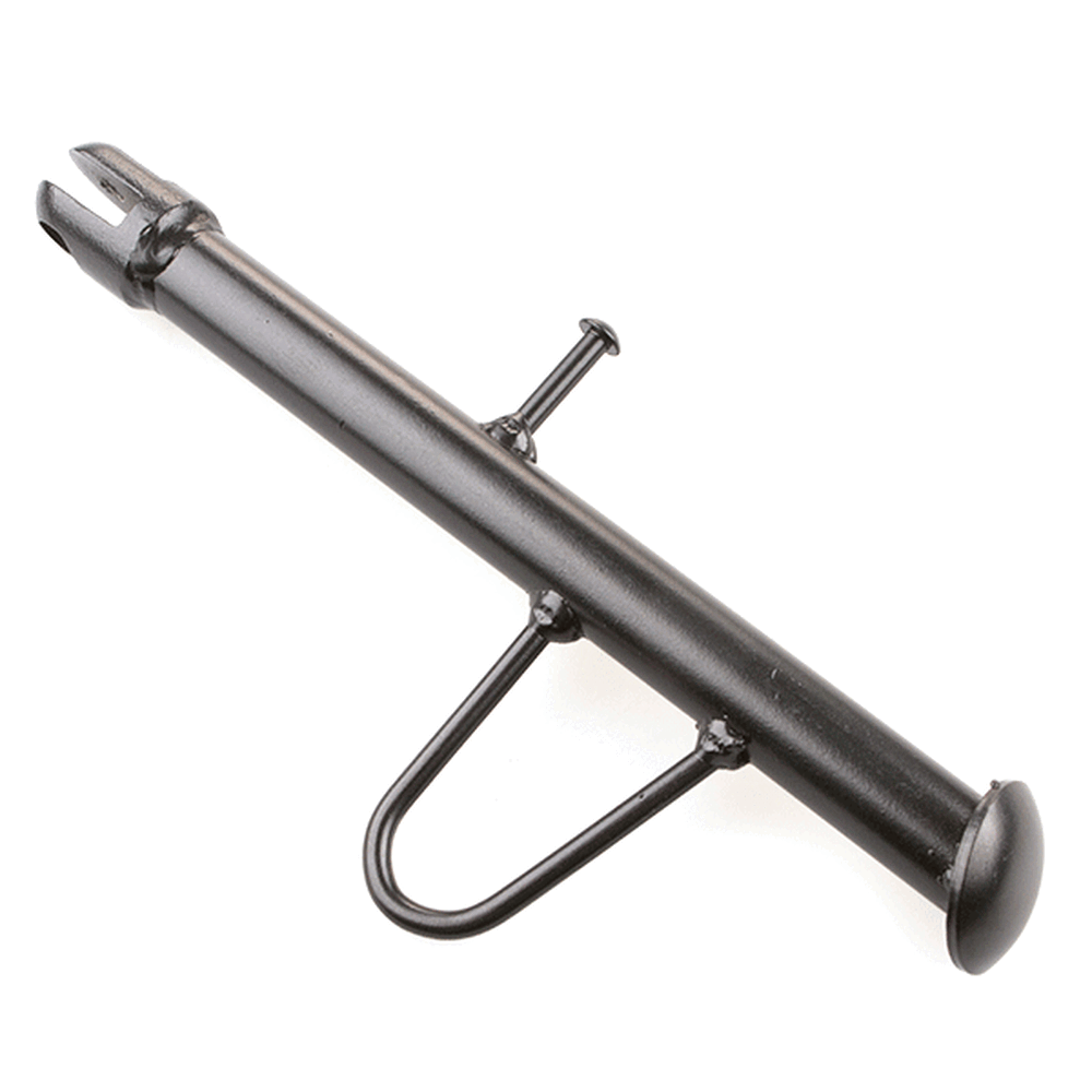 The side stand, also known as the kickstand, is a support mechanism on a motorcycle that allows it to remain upright when parked. It is typically mounted on the left side of the motorcycle and extends downward to rest on the ground. When deployed, the side stand stabilizes the motorcycle by providing a solid base, preventing it from tipping over. The stand is often equipped with a spring mechanism that automatically retracts it when the motorcycle is in use, and may include a safety switch to prevent engine start if the stand is down.