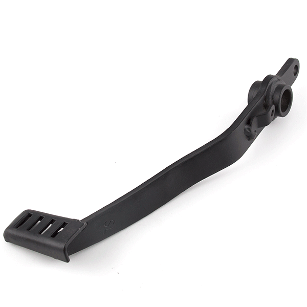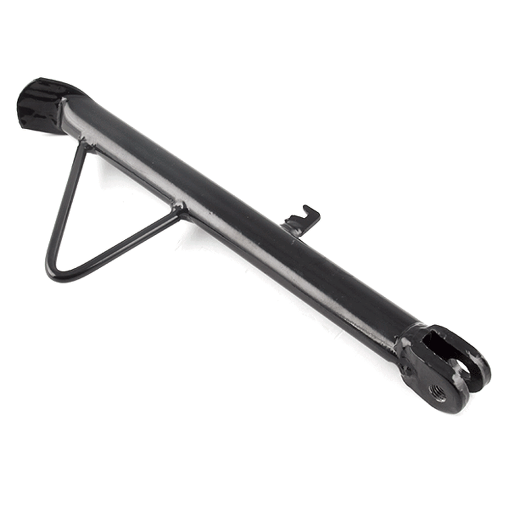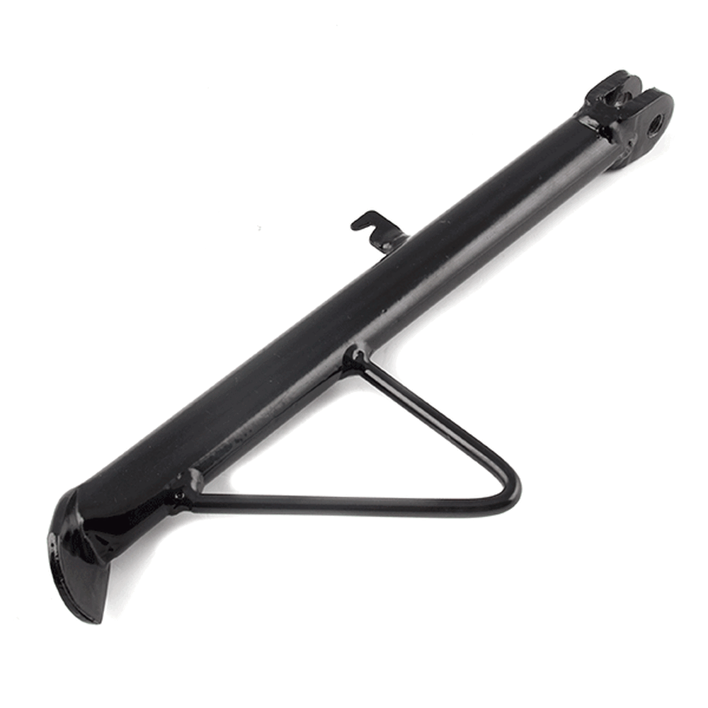 The side stand, also known as the kickstand, is a support mechanism on a motorcycle that allows it to remain upright when parked. It is typically mounted on the left side of the motorcycle and extends downward to rest on the ground. When deployed, the side stand stabilizes the motorcycle by providing a solid base, preventing it from tipping over. The stand is often equipped with a spring mechanism that automatically retracts it when the motorcycle is in use, and may include a safety switch to prevent engine start if the stand is down.