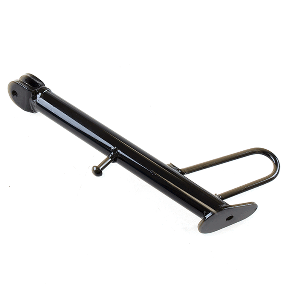 The side stand, also known as the kickstand, is a support mechanism on a motorcycle that allows it to remain upright when parked. It is typically mounted on the left side of the motorcycle and extends downward to rest on the ground. When deployed, the side stand stabilizes the motorcycle by providing a solid base, preventing it from tipping over. The stand is often equipped with a spring mechanism that automatically retracts it when the motorcycle is in use, and may include a safety switch to prevent engine start if the stand is down.
