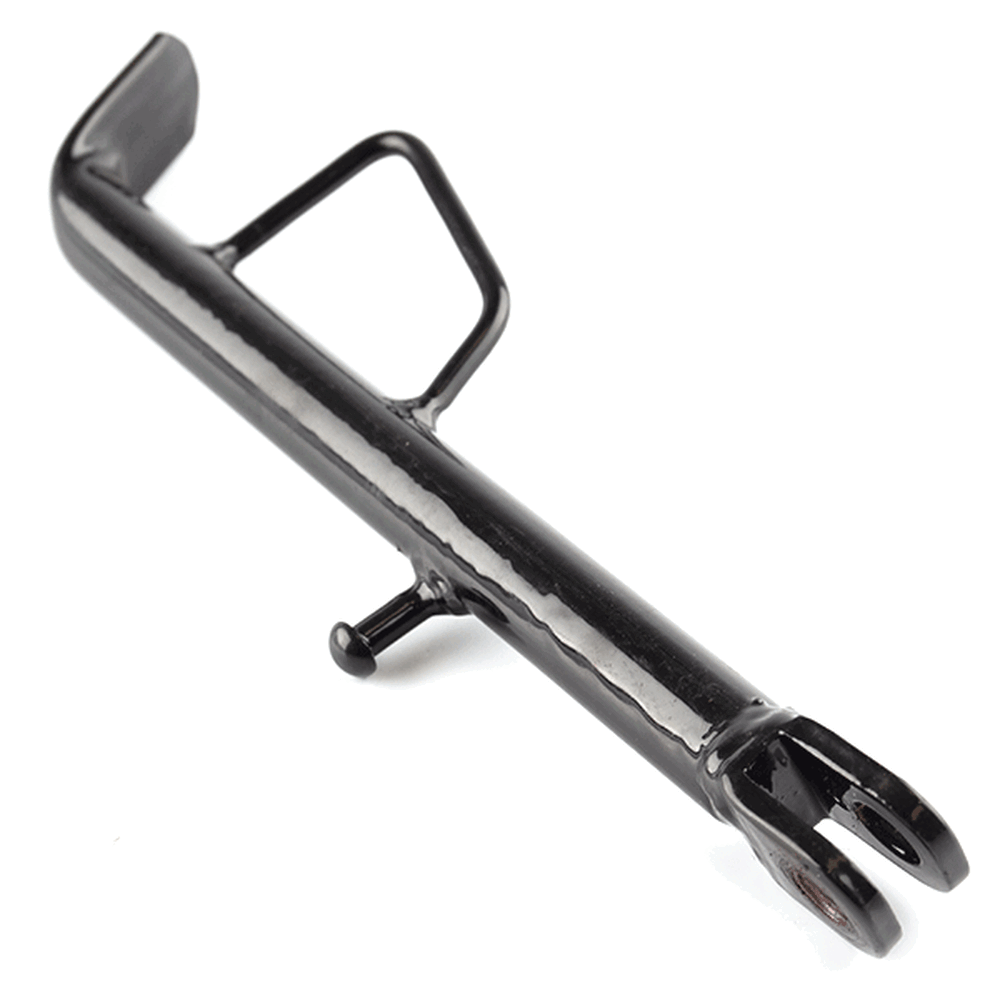 The side stand, also known as the kickstand, is a support mechanism on a motorcycle that allows it to remain upright when parked. It is typically mounted on the left side of the motorcycle and extends downward to rest on the ground. When deployed, the side stand stabilizes the motorcycle by providing a solid base, preventing it from tipping over. The stand is often equipped with a spring mechanism that automatically retracts it when the motorcycle is in use, and may include a safety switch to prevent engine start if the stand is down.