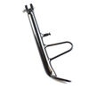 The side stand, also known as the kickstand, is a support mechanism on a motorcycle that allows it to remain upright when parked. It is typically mounted on the left side of the motorcycle and extends downward to rest on the ground. When deployed, the side stand stabilizes the motorcycle by providing a solid base, preventing it from tipping over. The stand is often equipped with a spring mechanism that automatically retracts it when the motorcycle is in use, and may include a safety switch to prevent engine start if the stand is down.