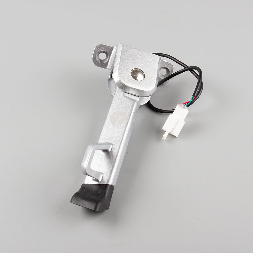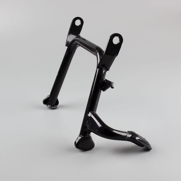 The side stand, also known as the kickstand, is a support mechanism on a motorcycle that allows it to remain upright when parked. It is typically mounted on the left side of the motorcycle and extends downward to rest on the ground. When deployed, the side stand stabilizes the motorcycle by providing a solid base, preventing it from tipping over. The stand is often equipped with a spring mechanism that automatically retracts it when the motorcycle is in use, and may include a safety switch to prevent engine start if the stand is down.