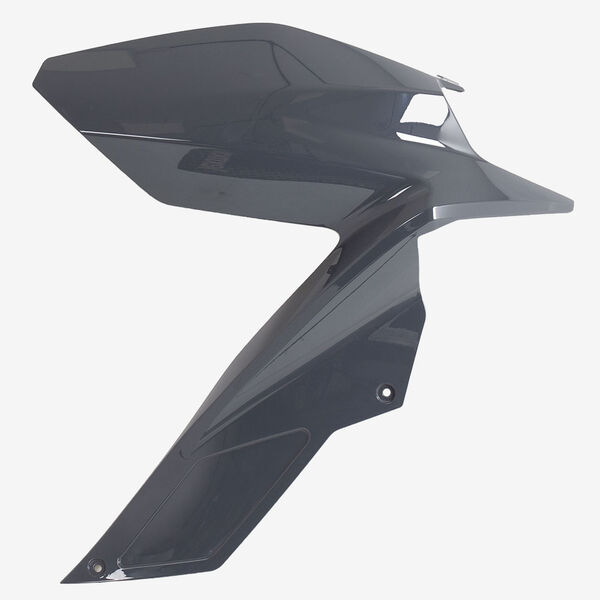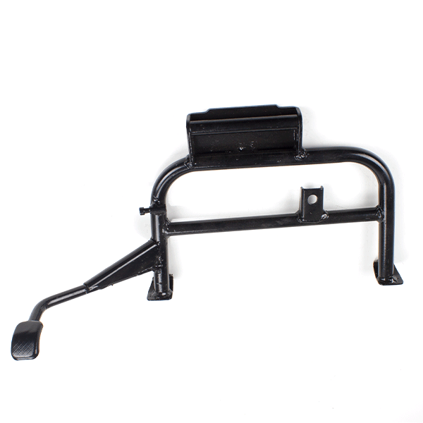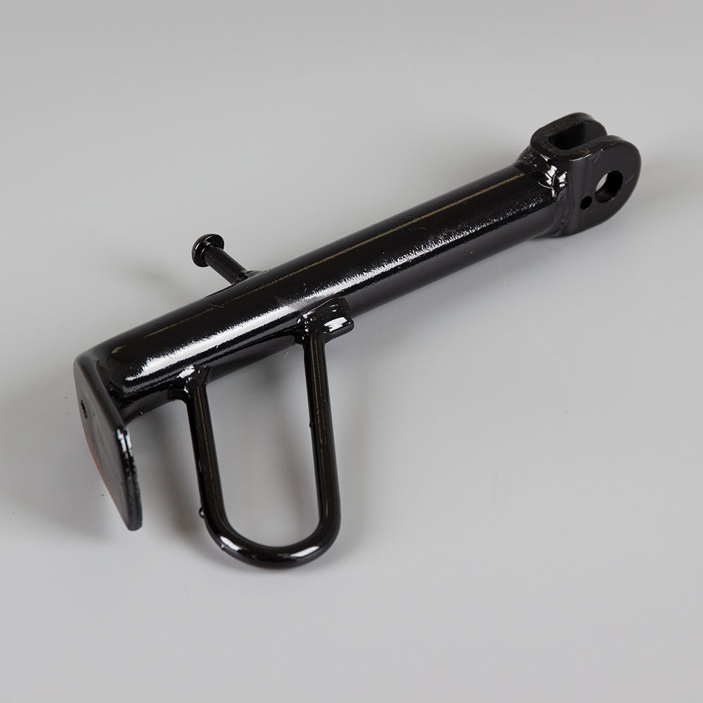 The side stand, also known as the kickstand, is a support mechanism on a motorcycle that allows it to remain upright when parked. It is typically mounted on the left side of the motorcycle and extends downward to rest on the ground. When deployed, the side stand stabilizes the motorcycle by providing a solid base, preventing it from tipping over. The stand is often equipped with a spring mechanism that automatically retracts it when the motorcycle is in use, and may include a safety switch to prevent engine start if the stand is down.