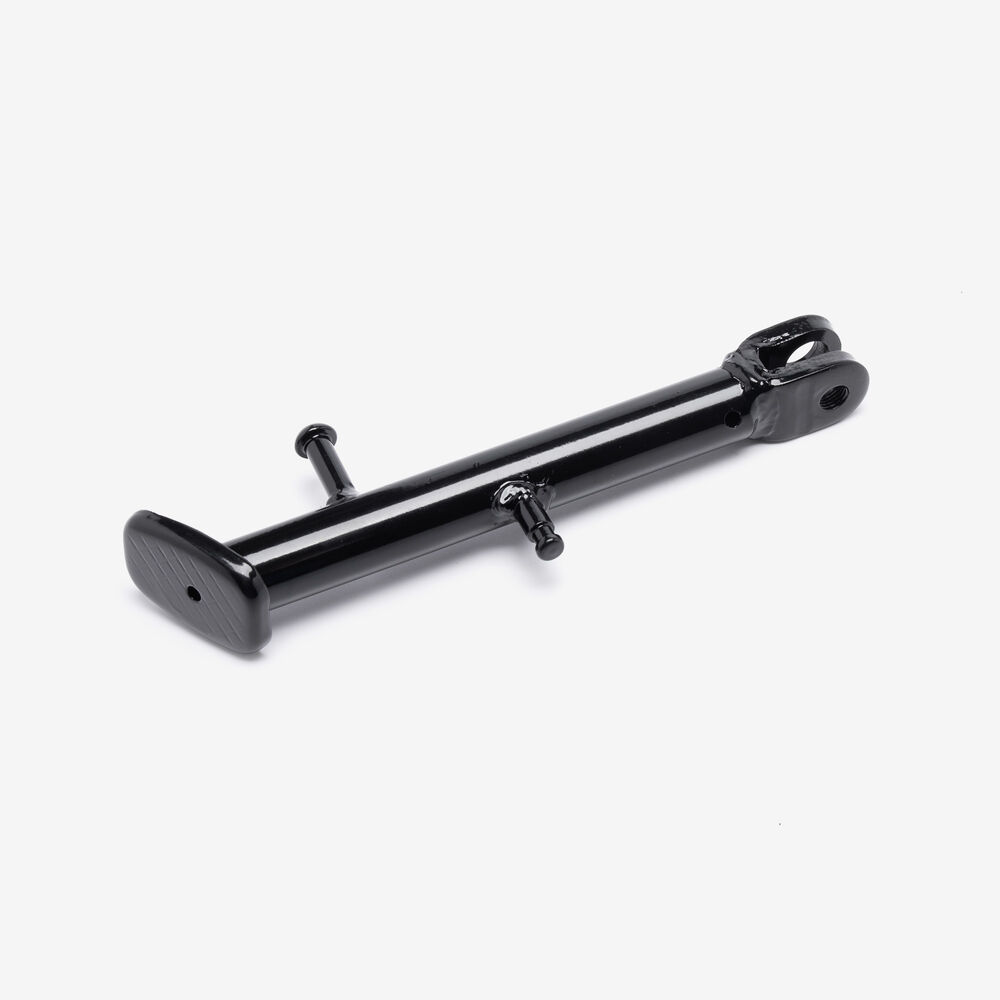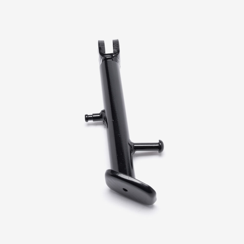 The side stand, also known as the kickstand, is a support mechanism on a motorcycle that allows it to remain upright when parked. It is typically mounted on the left side of the motorcycle and extends downward to rest on the ground. When deployed, the side stand stabilizes the motorcycle by providing a solid base, preventing it from tipping over. The stand is often equipped with a spring mechanism that automatically retracts it when the motorcycle is in use, and may include a safety switch to prevent engine start if the stand is down.