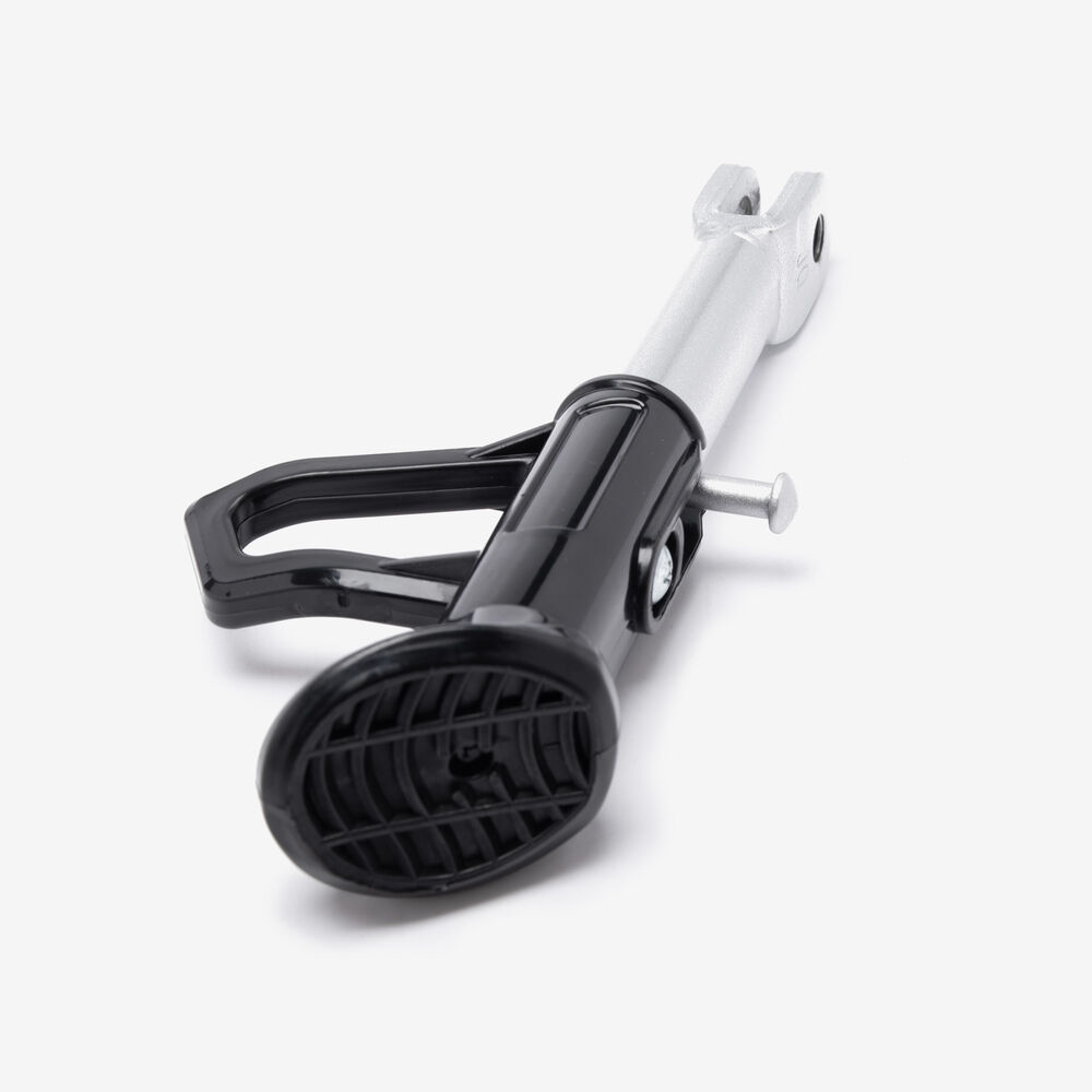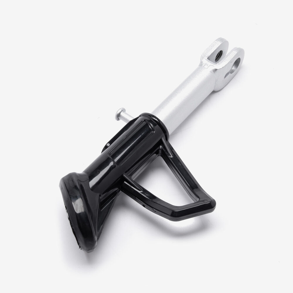 The side stand, also known as the kickstand, is a support mechanism on a motorcycle that allows it to remain upright when parked. It is typically mounted on the left side of the motorcycle and extends downward to rest on the ground. When deployed, the side stand stabilizes the motorcycle by providing a solid base, preventing it from tipping over. The stand is often equipped with a spring mechanism that automatically retracts it when the motorcycle is in use, and may include a safety switch to prevent engine start if the stand is down.