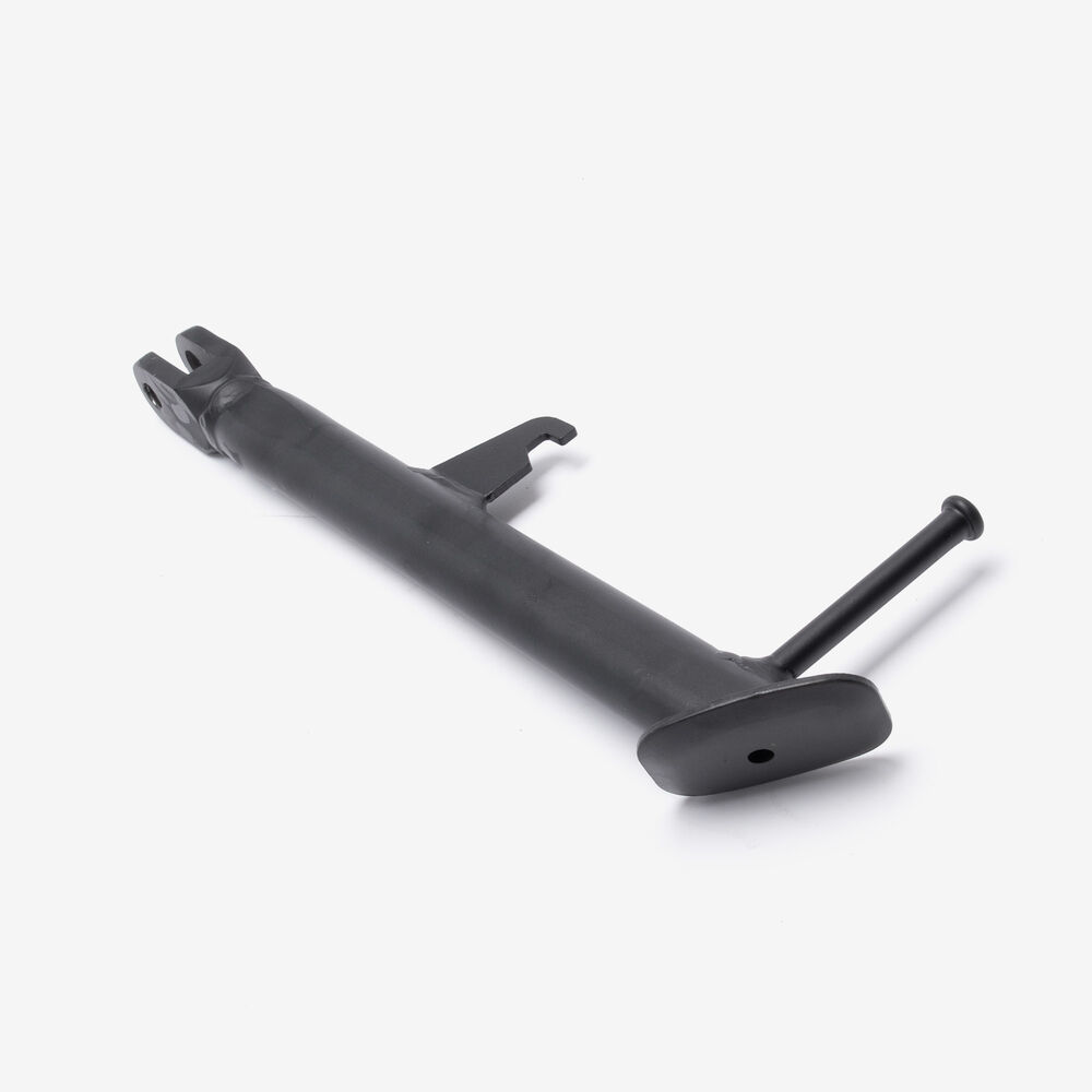 The side stand, also known as the kickstand, is a support mechanism on a motorcycle that allows it to remain upright when parked. It is typically mounted on the left side of the motorcycle and extends downward to rest on the ground. When deployed, the side stand stabilizes the motorcycle by providing a solid base, preventing it from tipping over. The stand is often equipped with a spring mechanism that automatically retracts it when the motorcycle is in use, and may include a safety switch to prevent engine start if the stand is down.