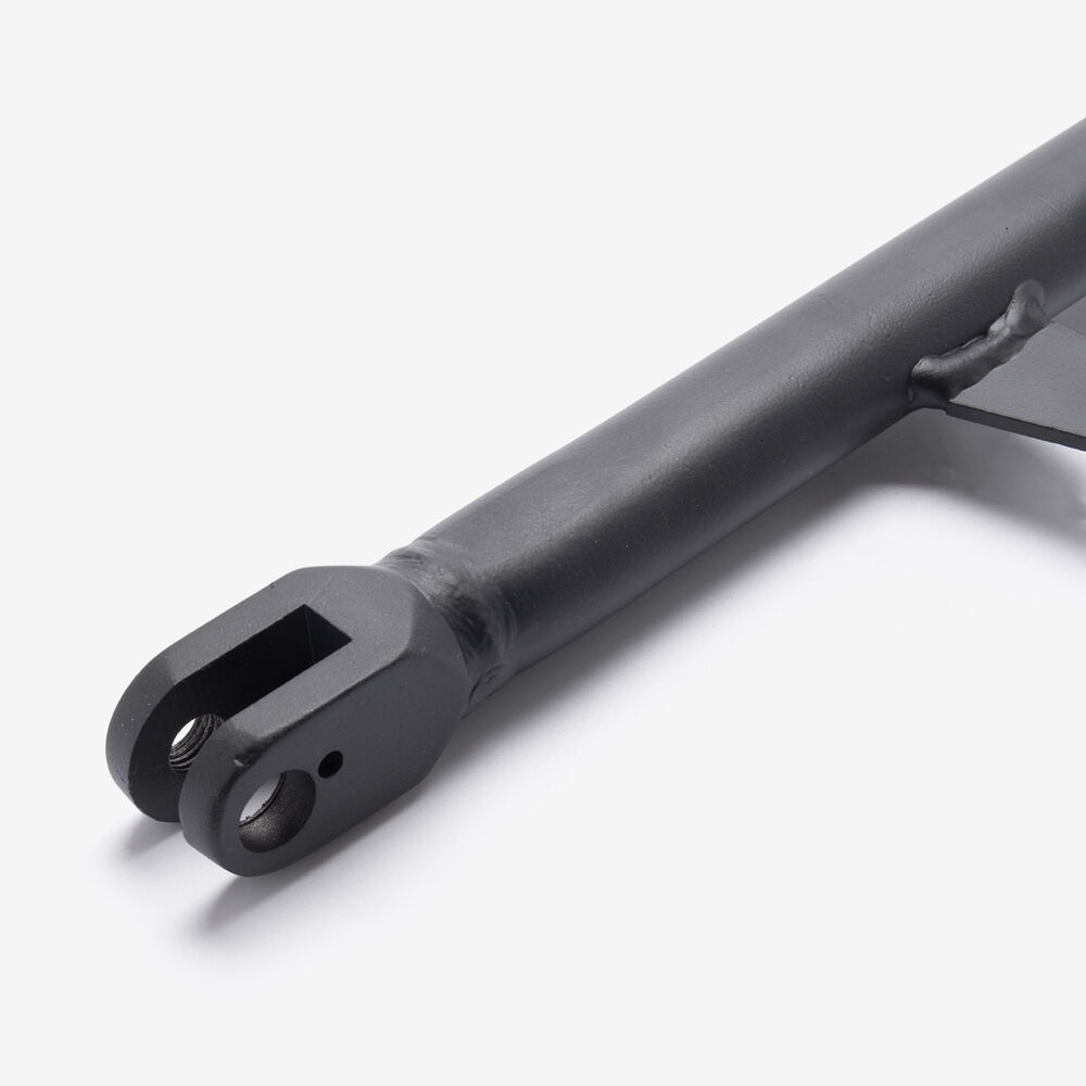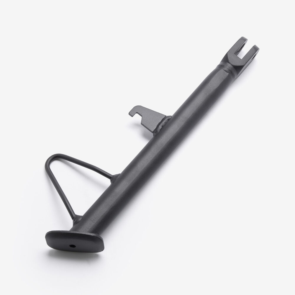 The side stand, also known as the kickstand, is a support mechanism on a motorcycle that allows it to remain upright when parked. It is typically mounted on the left side of the motorcycle and extends downward to rest on the ground. When deployed, the side stand stabilizes the motorcycle by providing a solid base, preventing it from tipping over. The stand is often equipped with a spring mechanism that automatically retracts it when the motorcycle is in use, and may include a safety switch to prevent engine start if the stand is down.