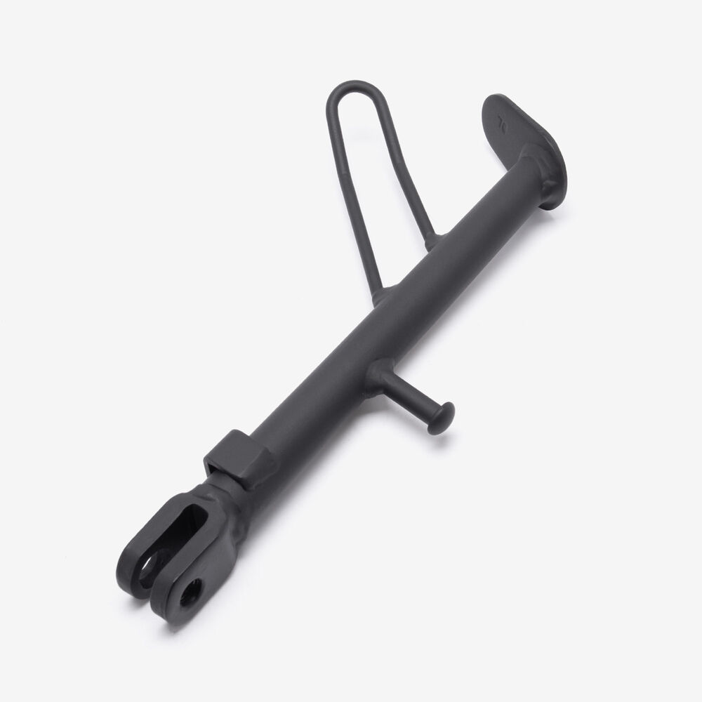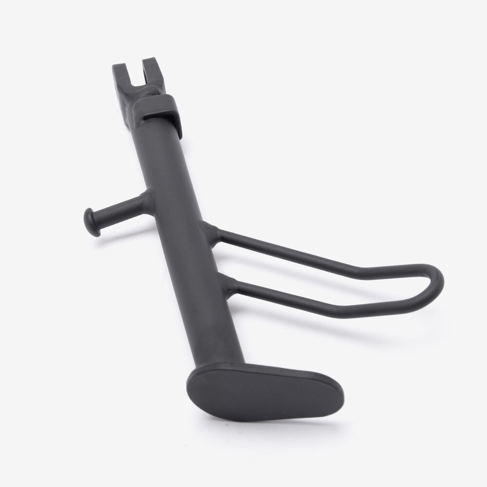 The side stand, also known as the kickstand, is a support mechanism on a motorcycle that allows it to remain upright when parked. It is typically mounted on the left side of the motorcycle and extends downward to rest on the ground. When deployed, the side stand stabilizes the motorcycle by providing a solid base, preventing it from tipping over. The stand is often equipped with a spring mechanism that automatically retracts it when the motorcycle is in use, and may include a safety switch to prevent engine start if the stand is down.