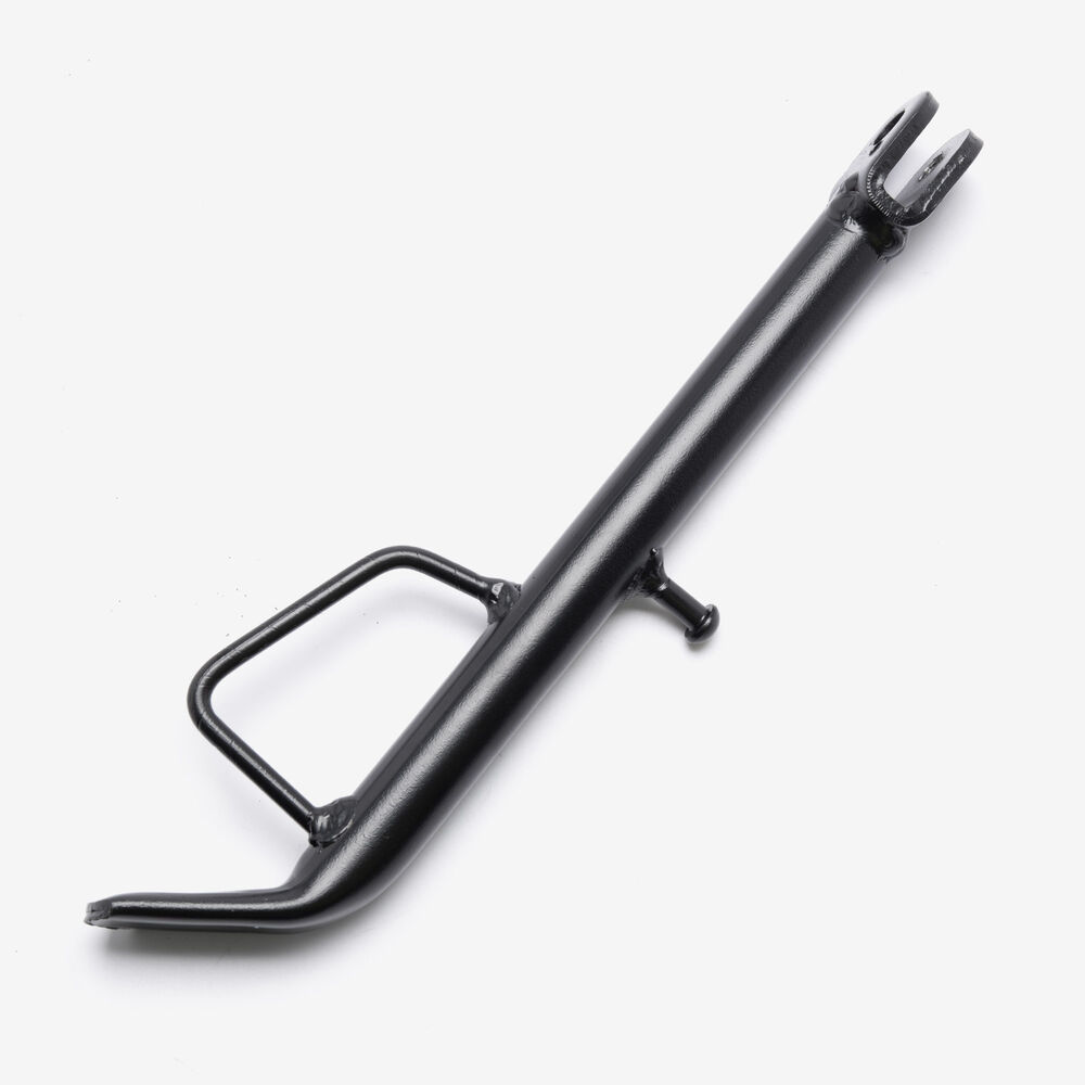 The side stand, also known as the kickstand, is a support mechanism on a motorcycle that allows it to remain upright when parked. It is typically mounted on the left side of the motorcycle and extends downward to rest on the ground. When deployed, the side stand stabilizes the motorcycle by providing a solid base, preventing it from tipping over. The stand is often equipped with a spring mechanism that automatically retracts it when the motorcycle is in use, and may include a safety switch to prevent engine start if the stand is down.