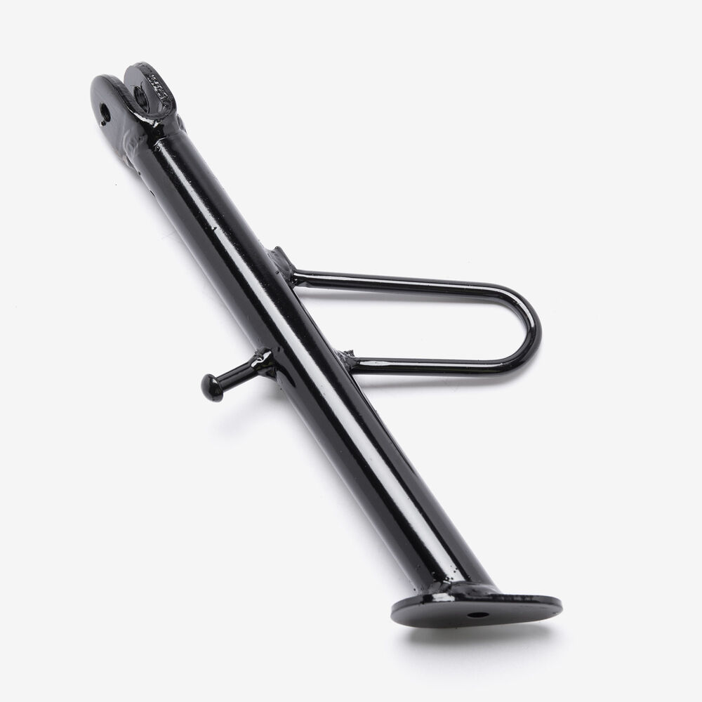 The side stand, also known as the kickstand, is a support mechanism on a motorcycle that allows it to remain upright when parked. It is typically mounted on the left side of the motorcycle and extends downward to rest on the ground. When deployed, the side stand stabilizes the motorcycle by providing a solid base, preventing it from tipping over. The stand is often equipped with a spring mechanism that automatically retracts it when the motorcycle is in use, and may include a safety switch to prevent engine start if the stand is down.
