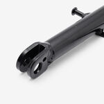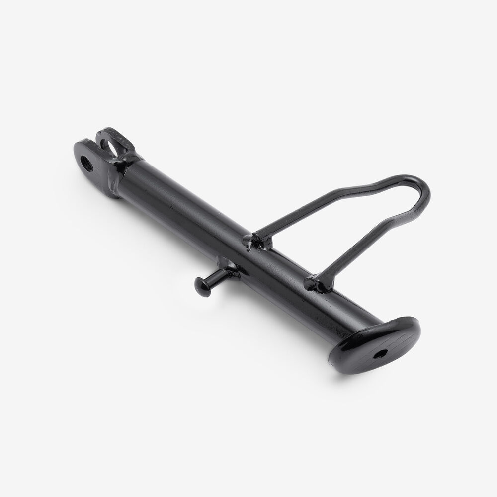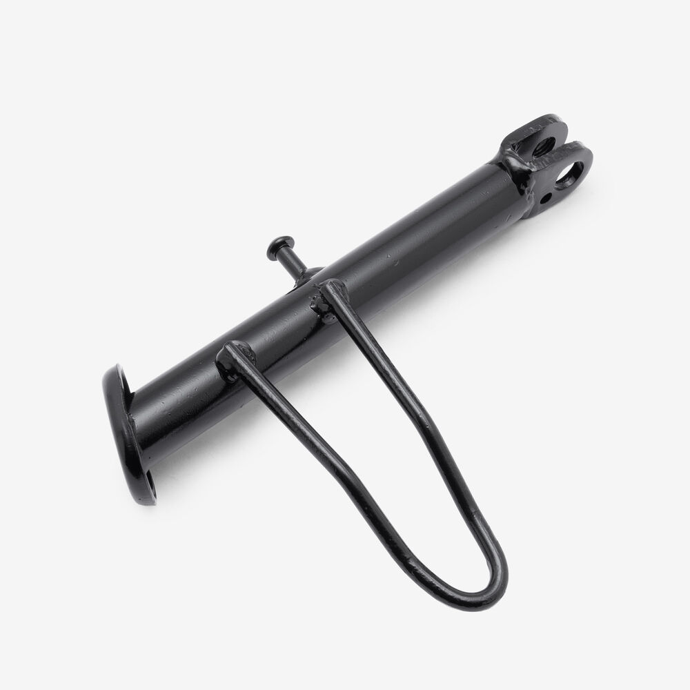 The side stand, also known as the kickstand, is a support mechanism on a motorcycle that allows it to remain upright when parked. It is typically mounted on the left side of the motorcycle and extends downward to rest on the ground. When deployed, the side stand stabilizes the motorcycle by providing a solid base, preventing it from tipping over. The stand is often equipped with a spring mechanism that automatically retracts it when the motorcycle is in use, and may include a safety switch to prevent engine start if the stand is down.