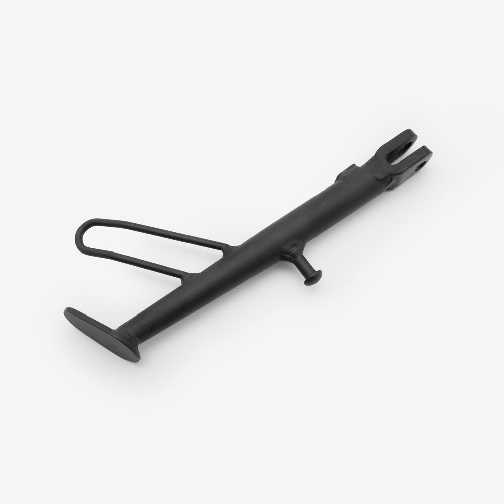 The side stand, also known as the kickstand, is a support mechanism on a motorcycle that allows it to remain upright when parked. It is typically mounted on the left side of the motorcycle and extends downward to rest on the ground. When deployed, the side stand stabilizes the motorcycle by providing a solid base, preventing it from tipping over. The stand is often equipped with a spring mechanism that automatically retracts it when the motorcycle is in use, and may include a safety switch to prevent engine start if the stand is down.