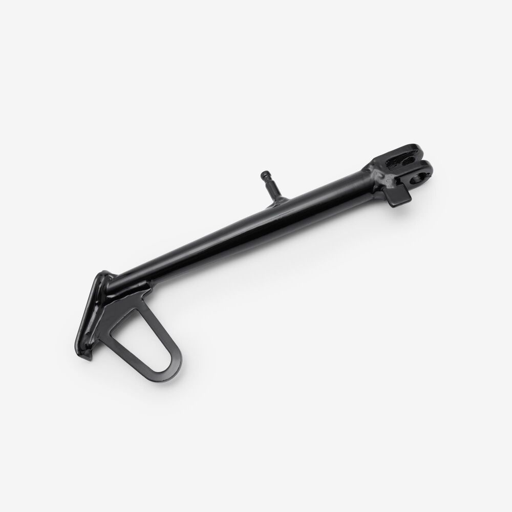 The side stand, also known as the kickstand, is a support mechanism on a motorcycle that allows it to remain upright when parked. It is typically mounted on the left side of the motorcycle and extends downward to rest on the ground. When deployed, the side stand stabilizes the motorcycle by providing a solid base, preventing it from tipping over. The stand is often equipped with a spring mechanism that automatically retracts it when the motorcycle is in use, and may include a safety switch to prevent engine start if the stand is down.