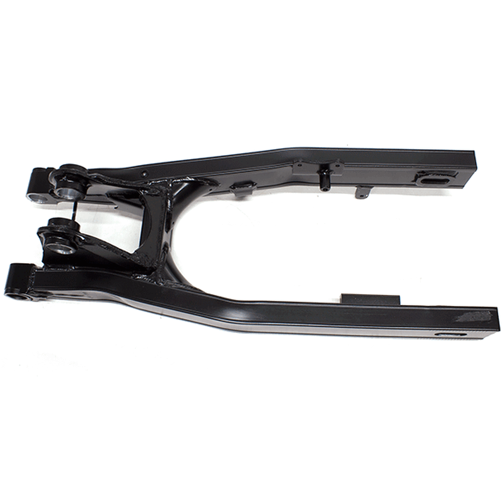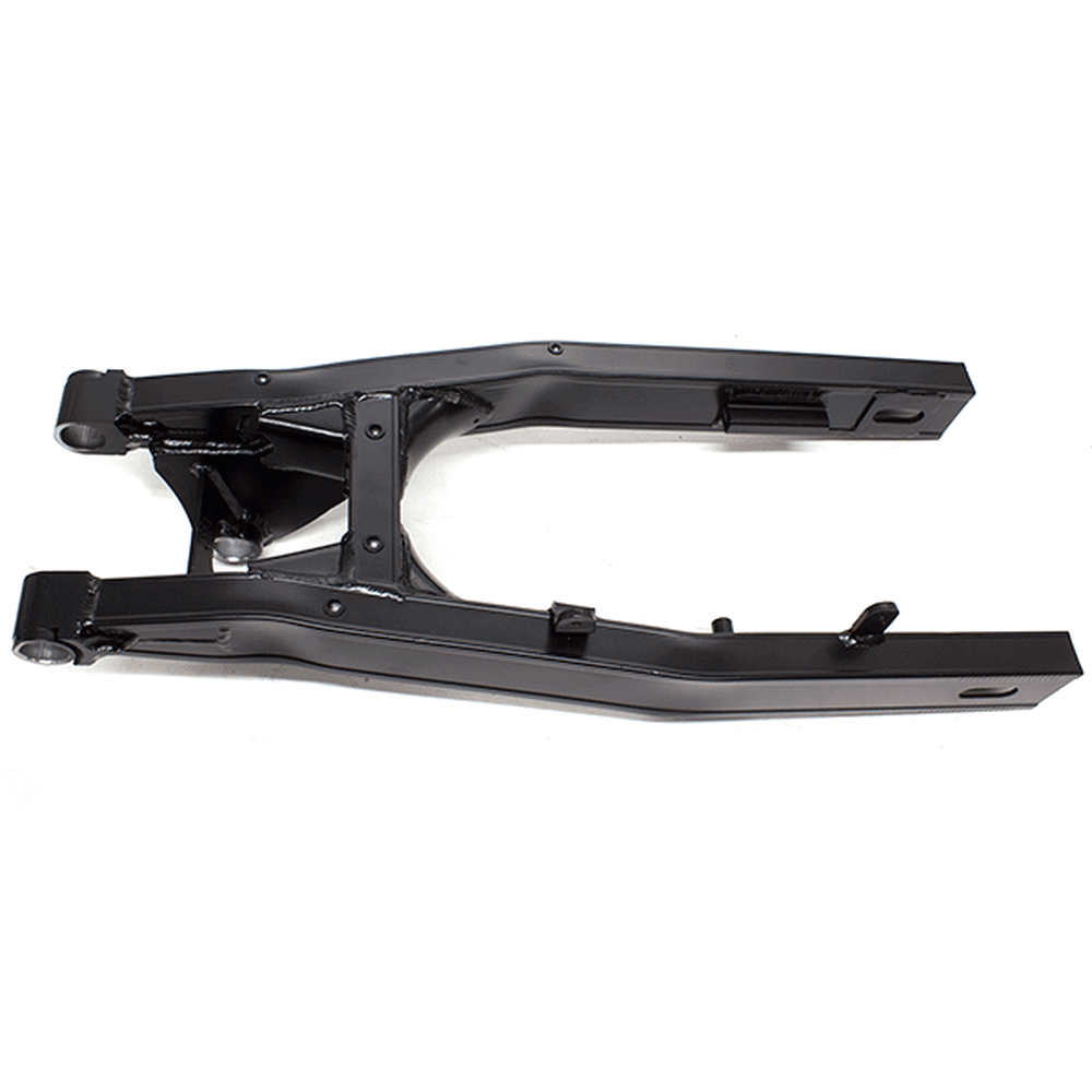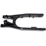 The swingarm is a key component of a motorcycle's rear suspension system. It connects the rear wheel to the motorcycle’s frame and allows the wheel to move up and down independently of the chassis. This pivoting action absorbs shocks and maintains stability, improving ride comfort and handling. The swingarm is typically made from aluminum or steel for strength and durability. It is mounted on the motorcycle's frame with a swingarm spindle or axle and is linked to the rear suspension system via a shock absorber or linkage.