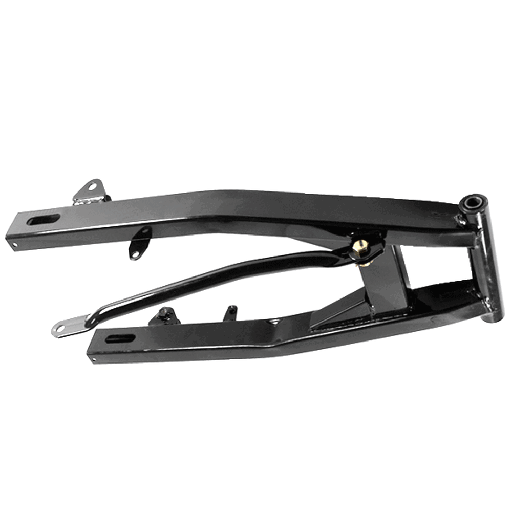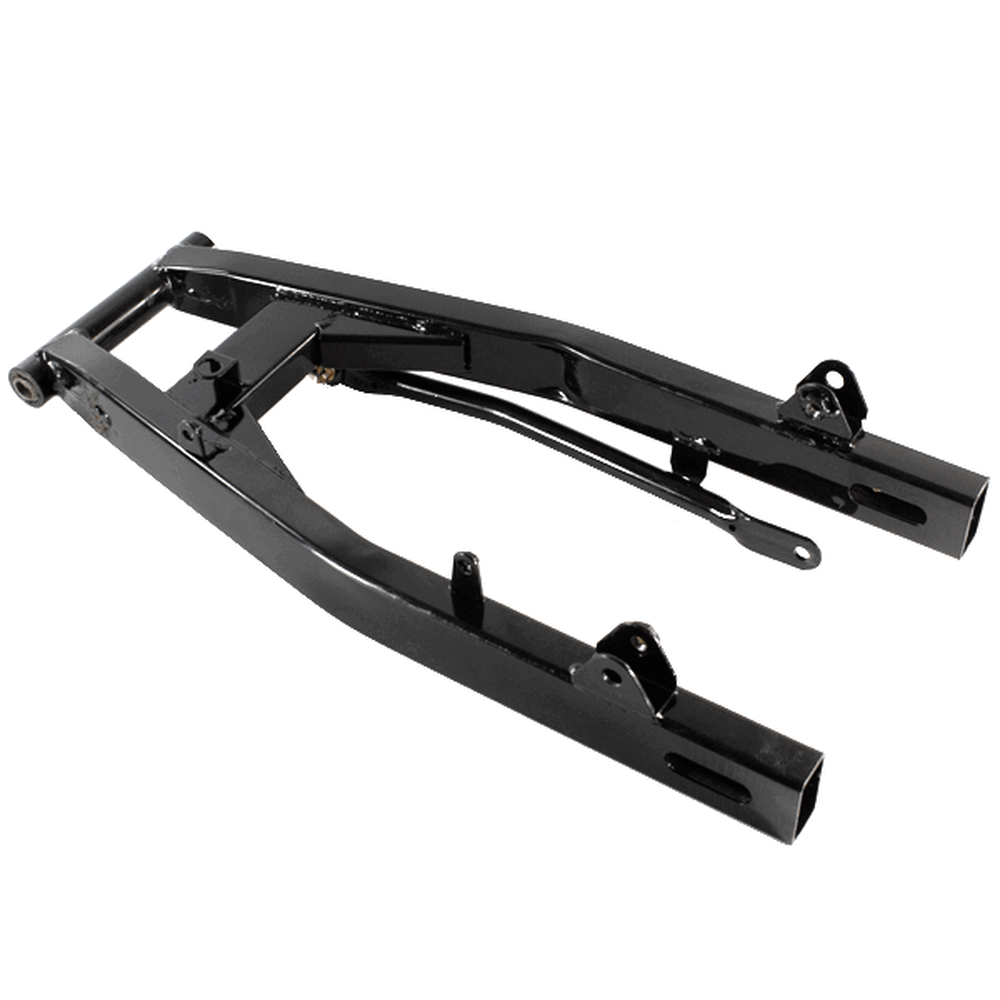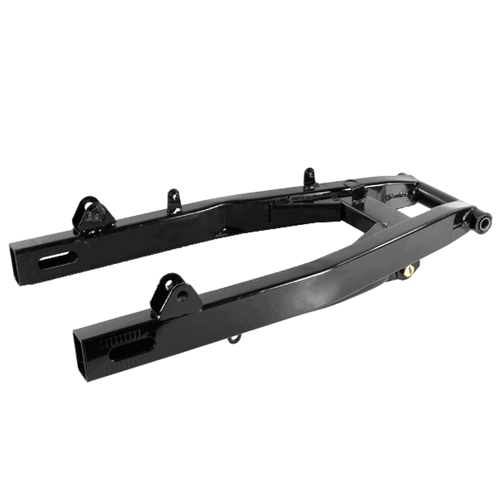 The swingarm is a key component of a motorcycle's rear suspension system. It connects the rear wheel to the motorcycle’s frame and allows the wheel to move up and down independently of the chassis. This pivoting action absorbs shocks and maintains stability, improving ride comfort and handling. The swingarm is typically made from aluminum or steel for strength and durability. It is mounted on the motorcycle's frame with a swingarm spindle or axle and is linked to the rear suspension system via a shock absorber or linkage.
