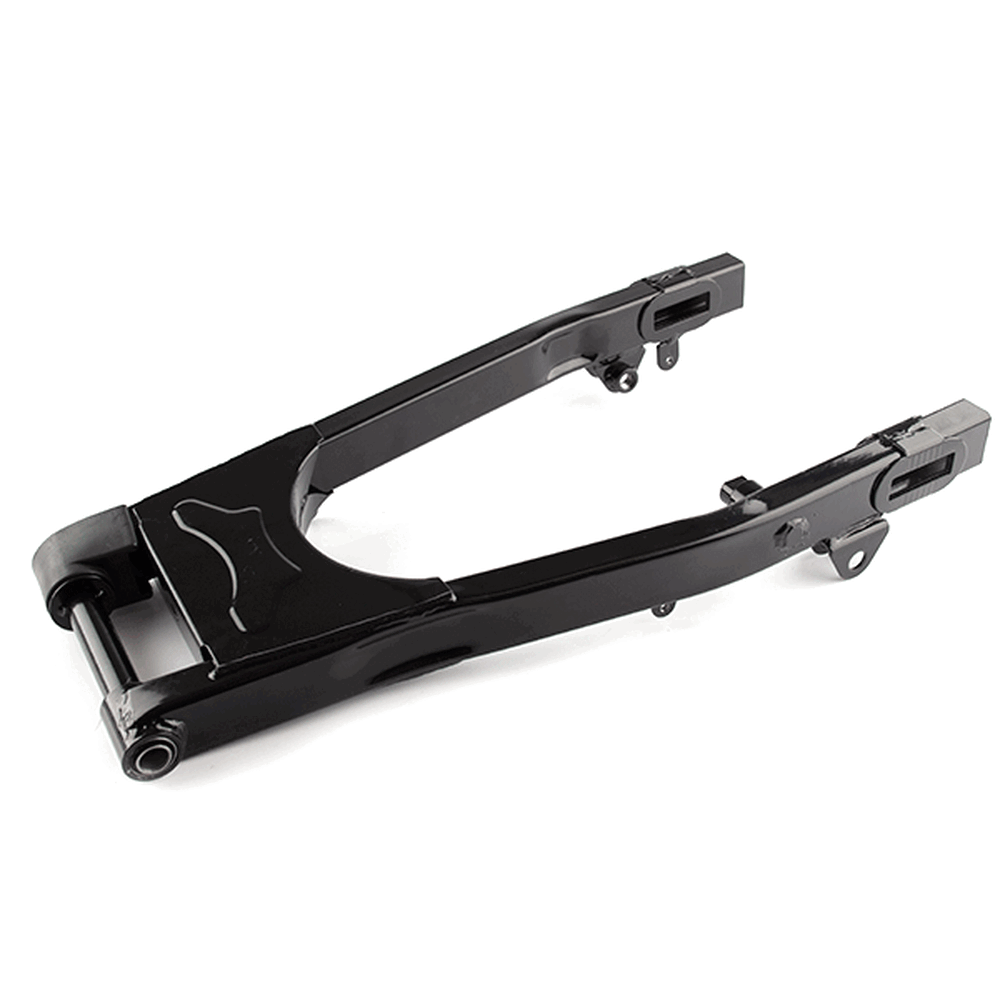 The swingarm is a key component of a motorcycle's rear suspension system. It connects the rear wheel to the motorcycle’s frame and allows the wheel to move up and down independently of the chassis. This pivoting action absorbs shocks and maintains stability, improving ride comfort and handling. The swingarm is typically made from aluminum or steel for strength and durability. It is mounted on the motorcycle's frame with a swingarm spindle or axle and is linked to the rear suspension system via a shock absorber or linkage.