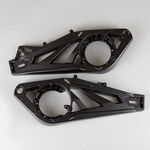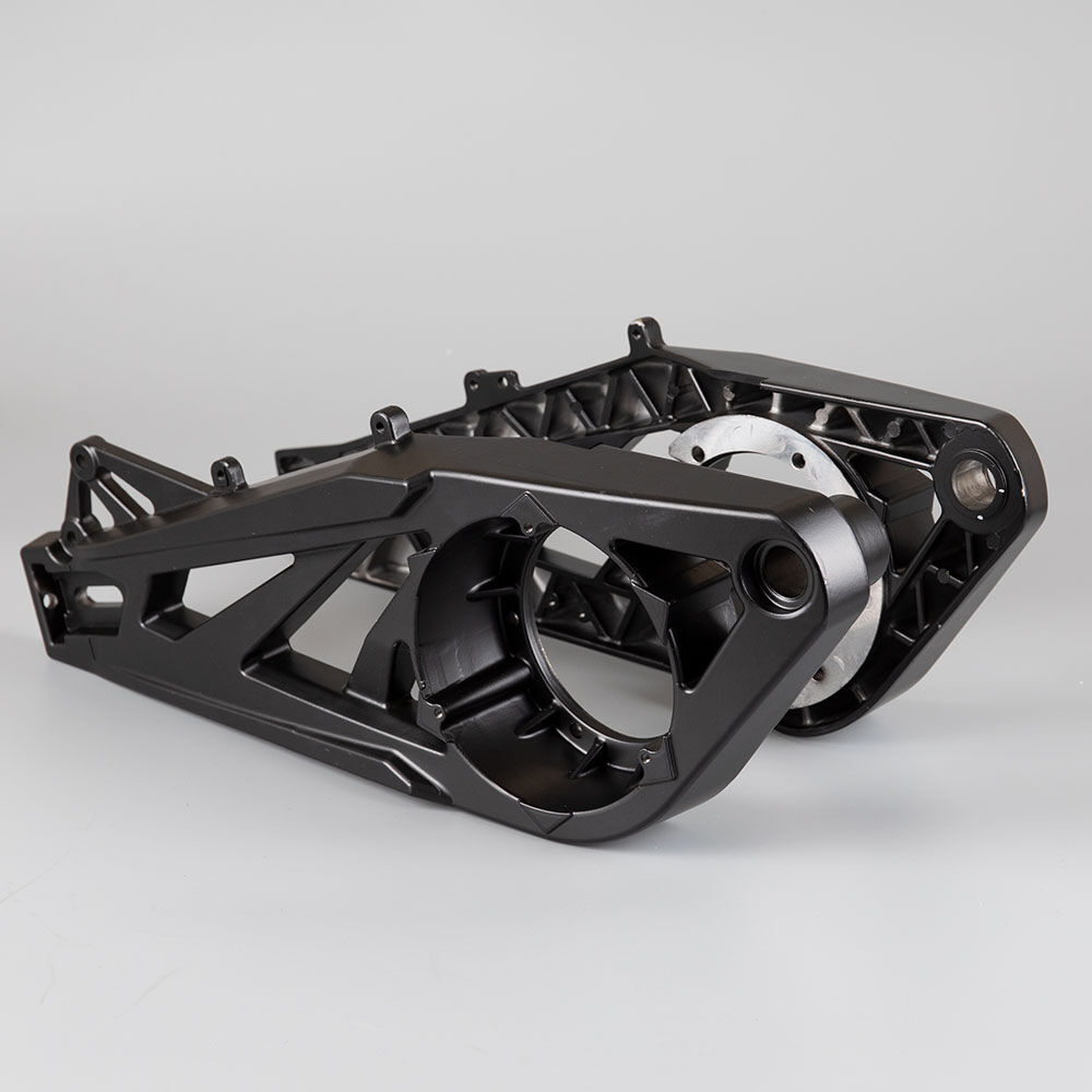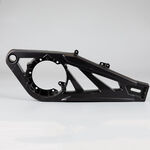 The swingarm is a key component of a motorcycle's rear suspension system. It connects the rear wheel to the motorcycle’s frame and allows the wheel to move up and down independently of the chassis. This pivoting action absorbs shocks and maintains stability, improving ride comfort and handling. The swingarm is typically made from aluminum or steel for strength and durability. It is mounted on the motorcycle's frame with a swingarm spindle or axle and is linked to the rear suspension system via a shock absorber or linkage.