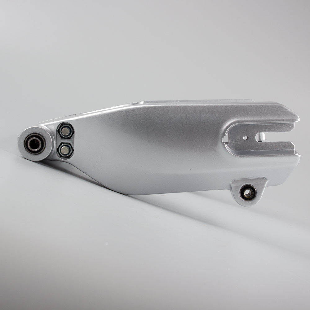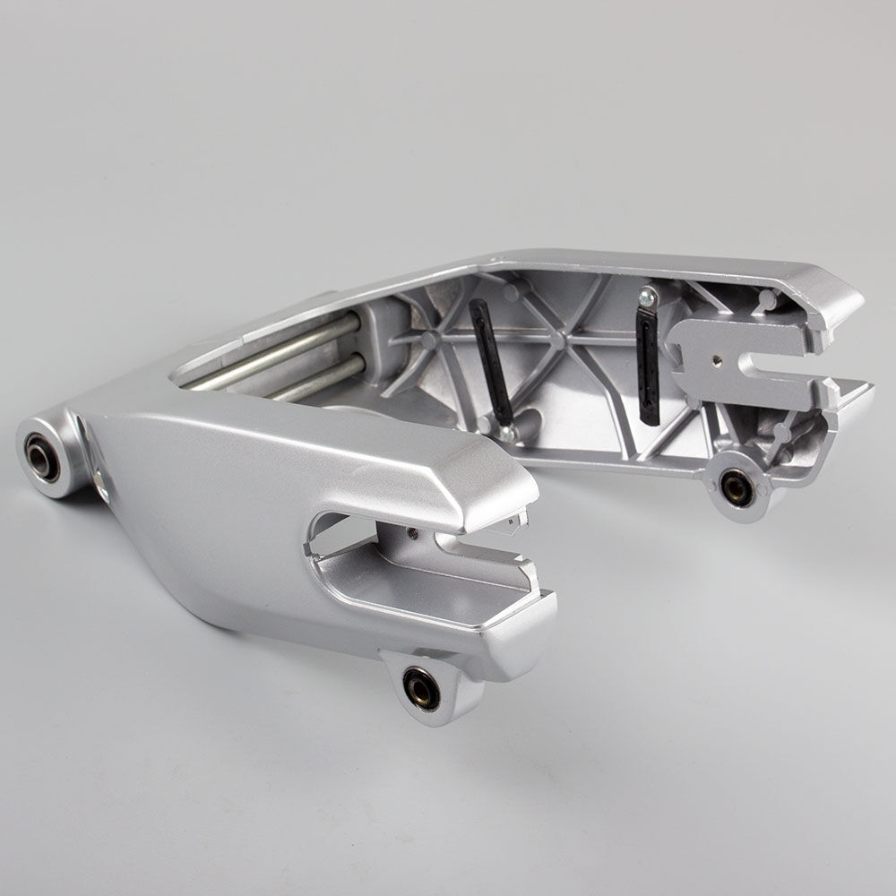 The swingarm is a key component of a motorcycle's rear suspension system. It connects the rear wheel to the motorcycle’s frame and allows the wheel to move up and down independently of the chassis. This pivoting action absorbs shocks and maintains stability, improving ride comfort and handling. The swingarm is typically made from aluminum or steel for strength and durability. It is mounted on the motorcycle's frame with a swingarm spindle or axle and is linked to the rear suspension system via a shock absorber or linkage.
