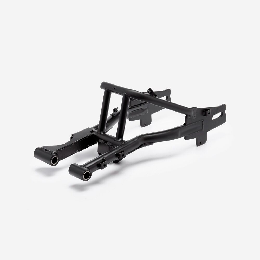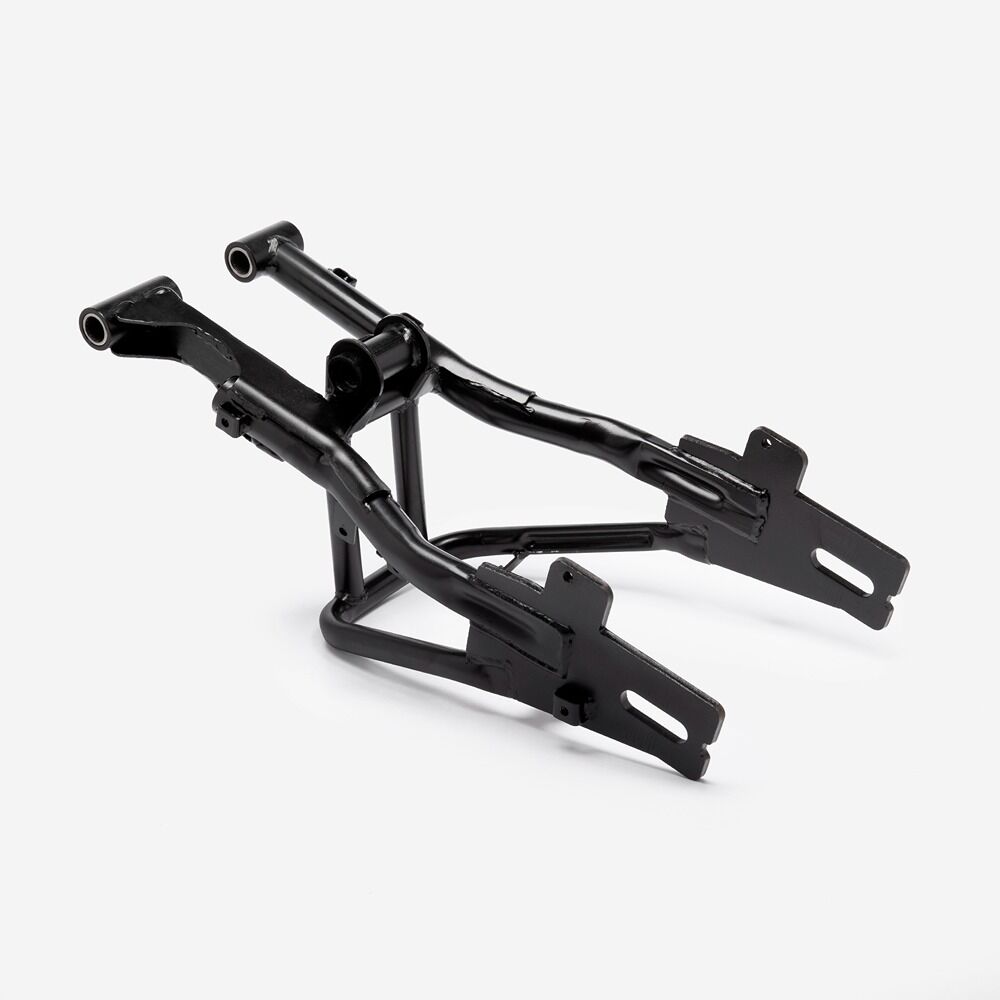 The swingarm is a key component of a motorcycle's rear suspension system. It connects the rear wheel to the motorcycle’s frame and allows the wheel to move up and down independently of the chassis. This pivoting action absorbs shocks and maintains stability, improving ride comfort and handling. The swingarm is typically made from aluminum or steel for strength and durability. It is mounted on the motorcycle's frame with a swingarm spindle or axle and is linked to the rear suspension system via a shock absorber or linkage.