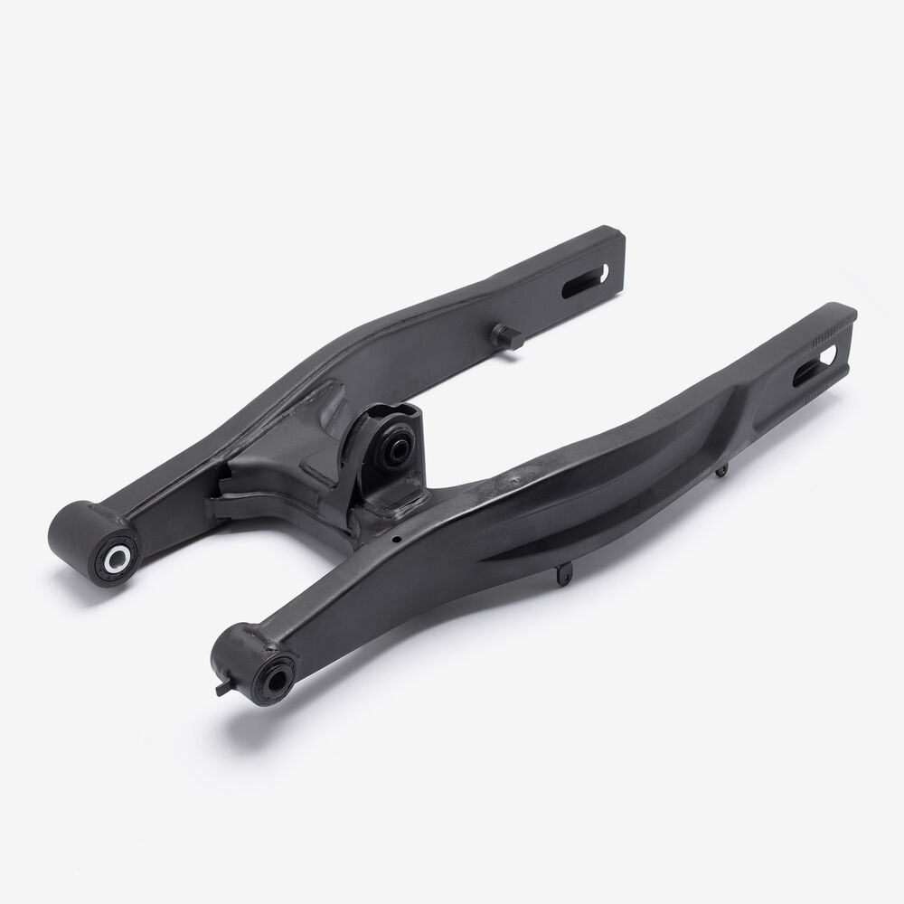 The swingarm is a key component of a motorcycle's rear suspension system. It connects the rear wheel to the motorcycle’s frame and allows the wheel to move up and down independently of the chassis. This pivoting action absorbs shocks and maintains stability, improving ride comfort and handling. The swingarm is typically made from aluminum or steel for strength and durability. It is mounted on the motorcycle's frame with a swingarm spindle or axle and is linked to the rear suspension system via a shock absorber or linkage.