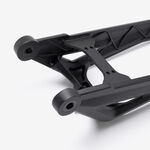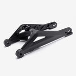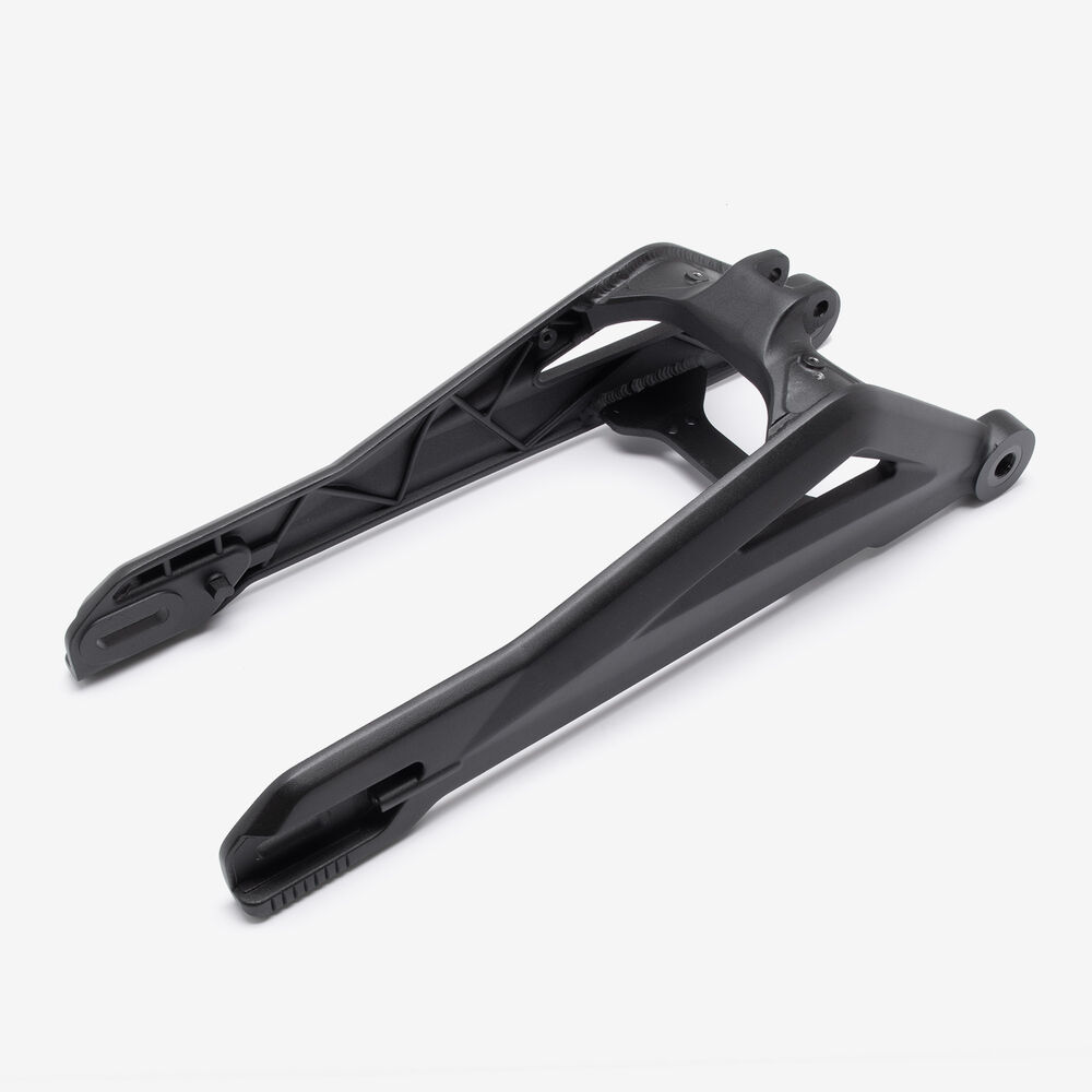 The swingarm is a key component of a motorcycle's rear suspension system. It connects the rear wheel to the motorcycle’s frame and allows the wheel to move up and down independently of the chassis. This pivoting action absorbs shocks and maintains stability, improving ride comfort and handling. The swingarm is typically made from aluminum or steel for strength and durability. It is mounted on the motorcycle's frame with a swingarm spindle or axle and is linked to the rear suspension system via a shock absorber or linkage.