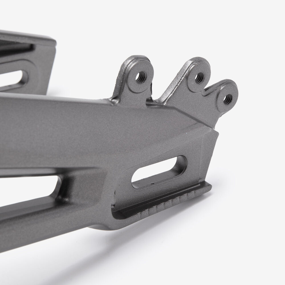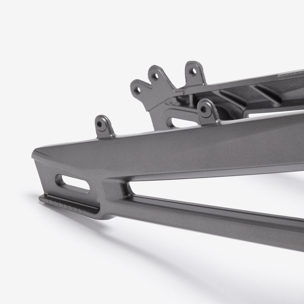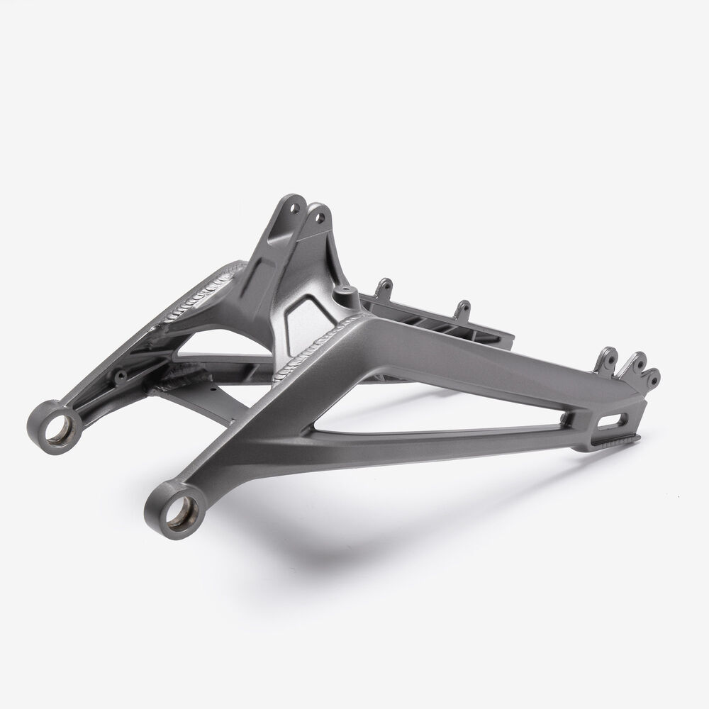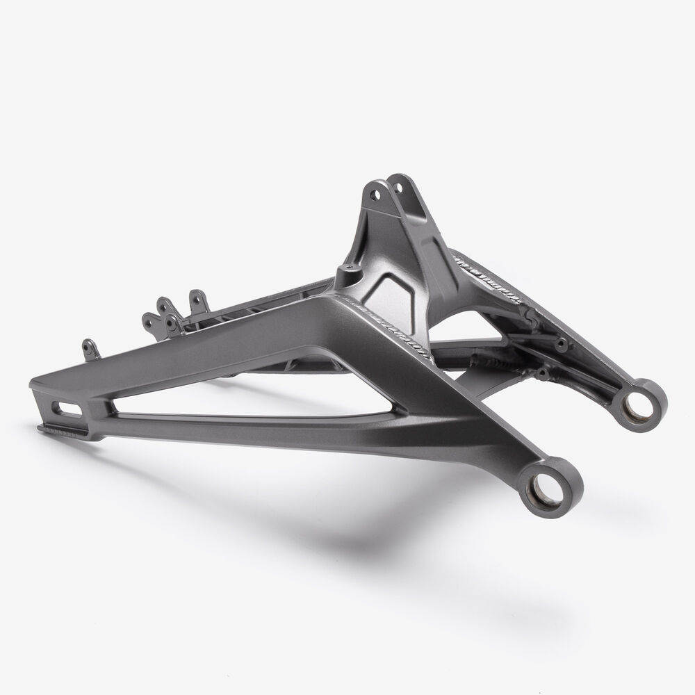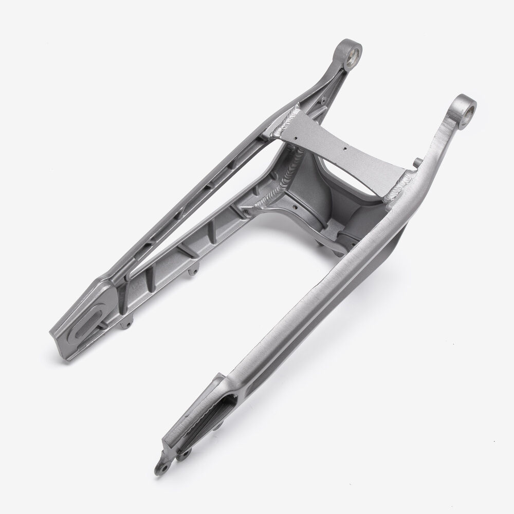 The swingarm is a key component of a motorcycle's rear suspension system. It connects the rear wheel to the motorcycle’s frame and allows the wheel to move up and down independently of the chassis. This pivoting action absorbs shocks and maintains stability, improving ride comfort and handling. The swingarm is typically made from aluminum or steel for strength and durability. It is mounted on the motorcycle's frame with a swingarm spindle or axle and is linked to the rear suspension system via a shock absorber or linkage.