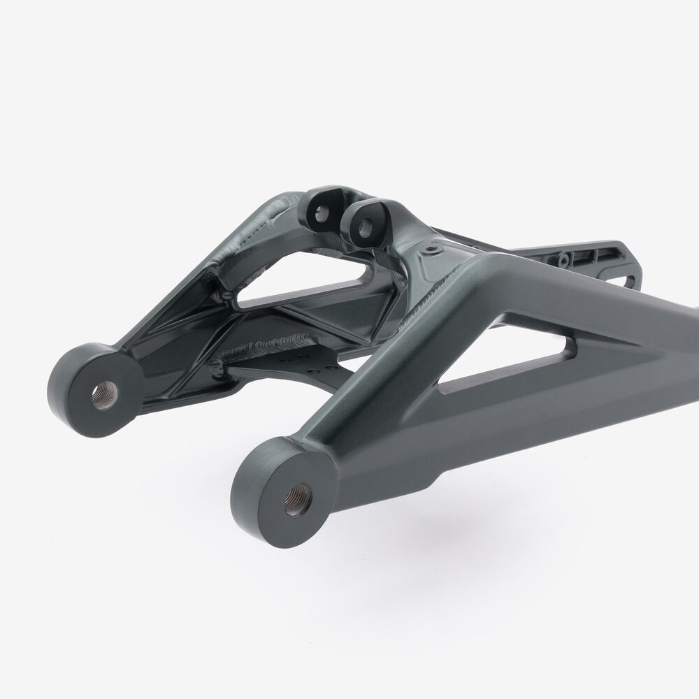 The swingarm is a key component of a motorcycle's rear suspension system. It connects the rear wheel to the motorcycle’s frame and allows the wheel to move up and down independently of the chassis. This pivoting action absorbs shocks and maintains stability, improving ride comfort and handling. The swingarm is typically made from aluminum or steel for strength and durability. It is mounted on the motorcycle's frame with a swingarm spindle or axle and is linked to the rear suspension system via a shock absorber or linkage.