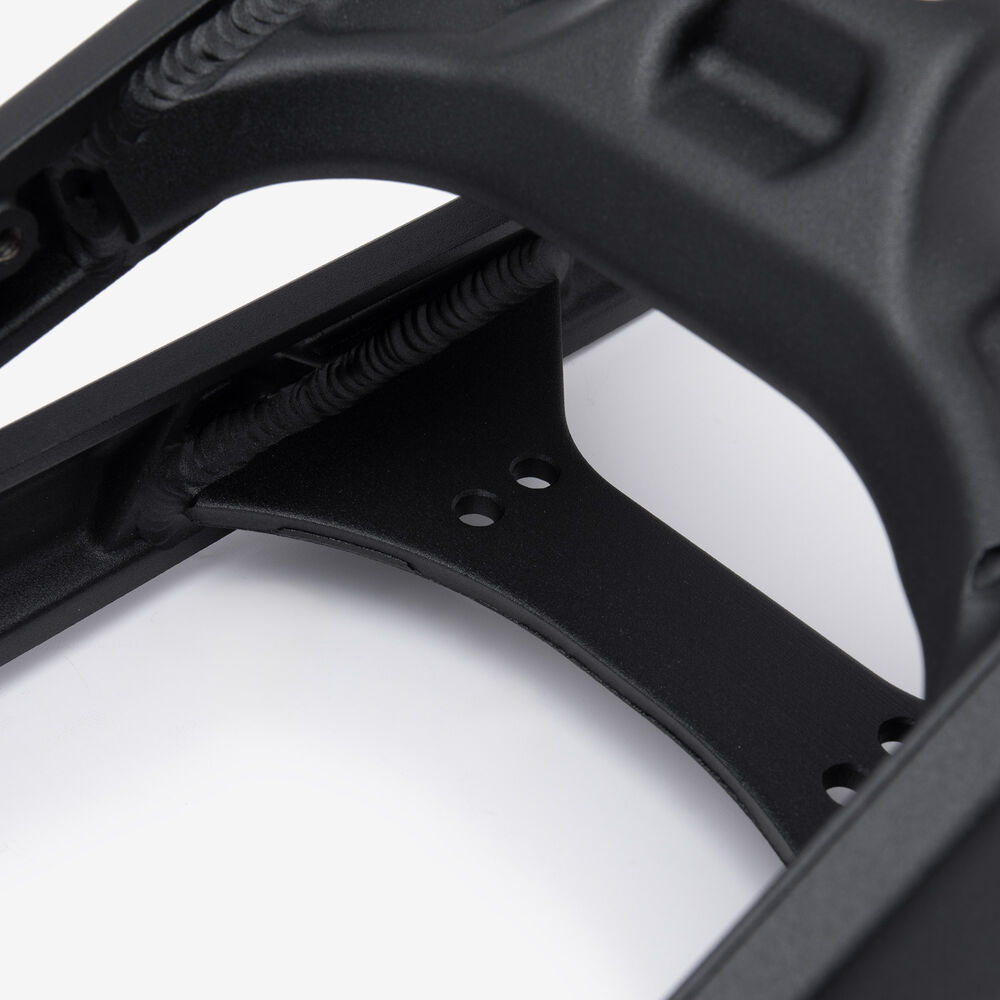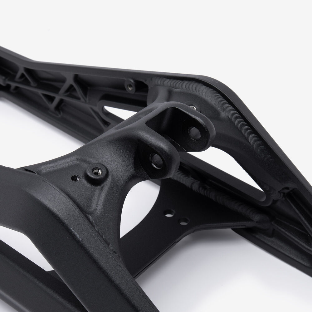 The swingarm is a key component of a motorcycle's rear suspension system. It connects the rear wheel to the motorcycle’s frame and allows the wheel to move up and down independently of the chassis. This pivoting action absorbs shocks and maintains stability, improving ride comfort and handling. The swingarm is typically made from aluminum or steel for strength and durability. It is mounted on the motorcycle's frame with a swingarm spindle or axle and is linked to the rear suspension system via a shock absorber or linkage.
