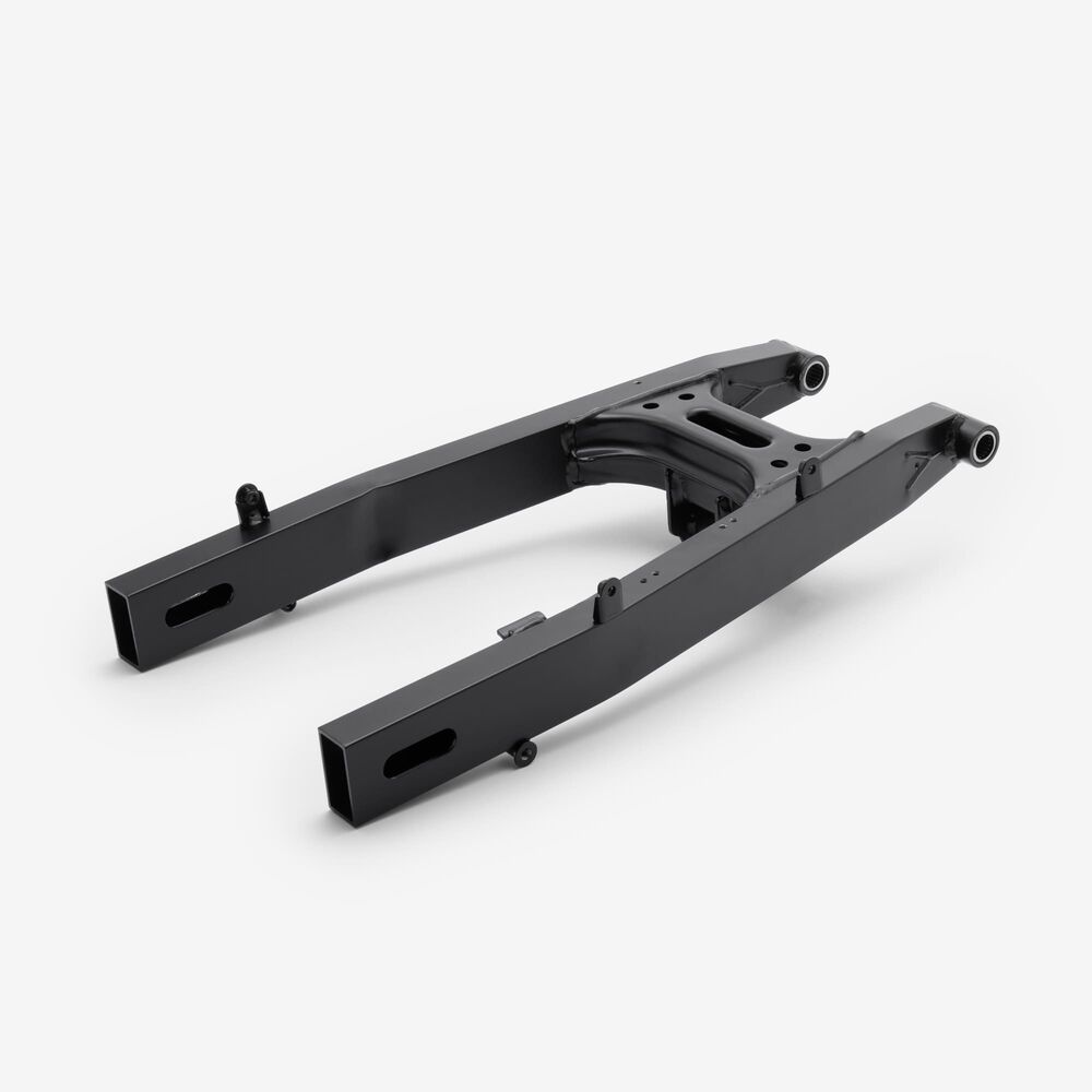 The swingarm is a key component of a motorcycle's rear suspension system. It connects the rear wheel to the motorcycle’s frame and allows the wheel to move up and down independently of the chassis. This pivoting action absorbs shocks and maintains stability, improving ride comfort and handling. The swingarm is typically made from aluminum or steel for strength and durability. It is mounted on the motorcycle's frame with a swingarm spindle or axle and is linked to the rear suspension system via a shock absorber or linkage.