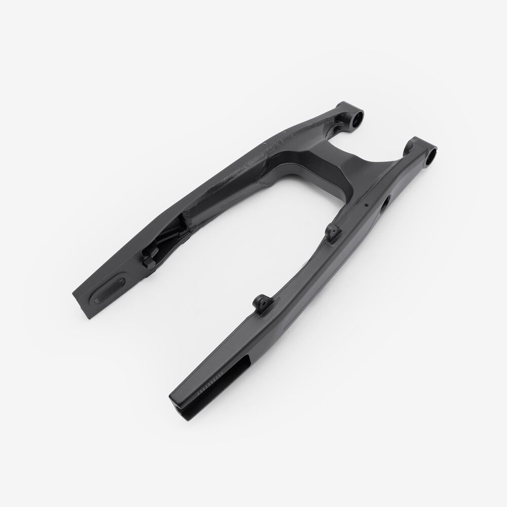 The swingarm is a key component of a motorcycle's rear suspension system. It connects the rear wheel to the motorcycle’s frame and allows the wheel to move up and down independently of the chassis. This pivoting action absorbs shocks and maintains stability, improving ride comfort and handling. The swingarm is typically made from aluminum or steel for strength and durability. It is mounted on the motorcycle's frame with a swingarm spindle or axle and is linked to the rear suspension system via a shock absorber or linkage.