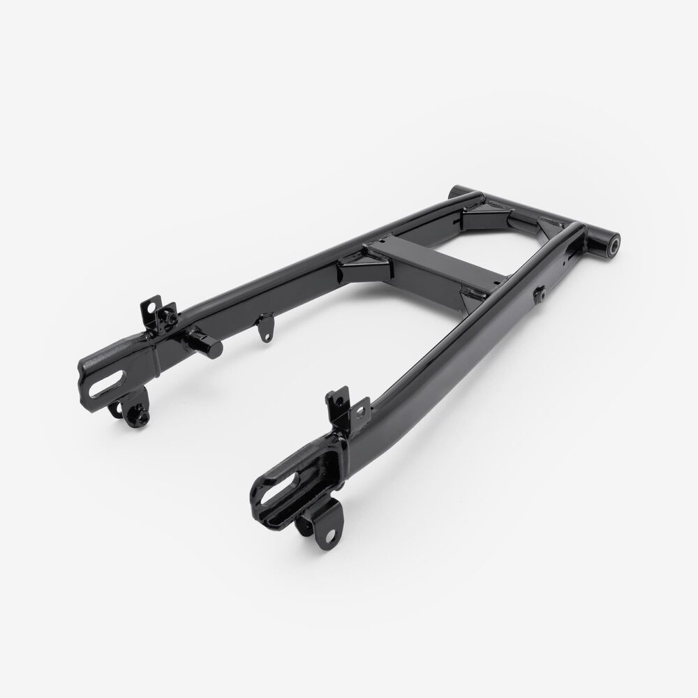 The swingarm is a key component of a motorcycle's rear suspension system. It connects the rear wheel to the motorcycle’s frame and allows the wheel to move up and down independently of the chassis. This pivoting action absorbs shocks and maintains stability, improving ride comfort and handling. The swingarm is typically made from aluminum or steel for strength and durability. It is mounted on the motorcycle's frame with a swingarm spindle or axle and is linked to the rear suspension system via a shock absorber or linkage.