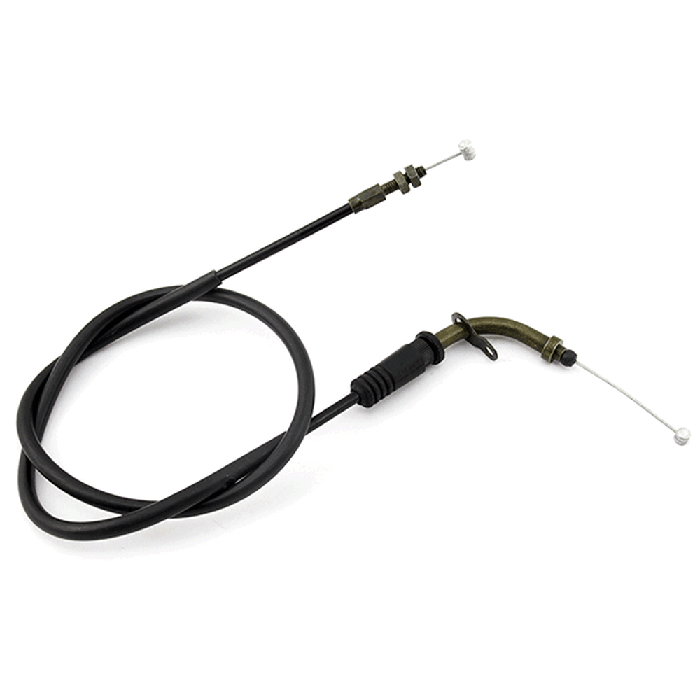 The throttle cable in a motorcycle is a flexible, wire-reinforced cable that connects the throttle grip to the throttle body or carburetor. It transmits the rider's input from twisting the throttle grip to the engine’s air intake system, allowing for precise control of engine power and acceleration. The throttle cable is designed to be durable and resistant to wear, providing smooth and reliable operation. Proper adjustment and maintenance of the throttle cable are essential for ensuring responsive throttle control and optimal engine performance.
