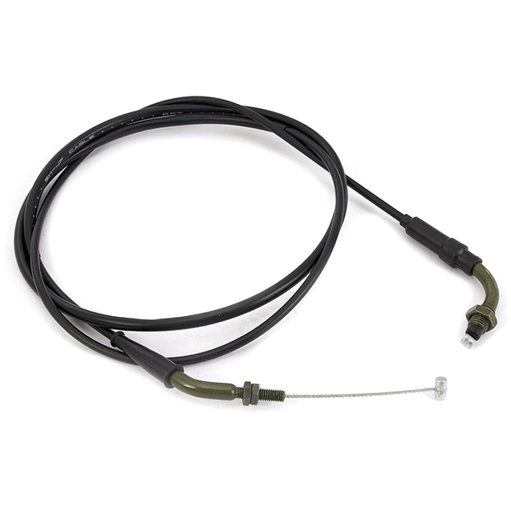 The throttle cable in a motorcycle is a flexible, wire-reinforced cable that connects the throttle grip to the throttle body or carburetor. It transmits the rider's input from twisting the throttle grip to the engine’s air intake system, allowing for precise control of engine power and acceleration. The throttle cable is designed to be durable and resistant to wear, providing smooth and reliable operation. Proper adjustment and maintenance of the throttle cable are essential for ensuring responsive throttle control and optimal engine performance.