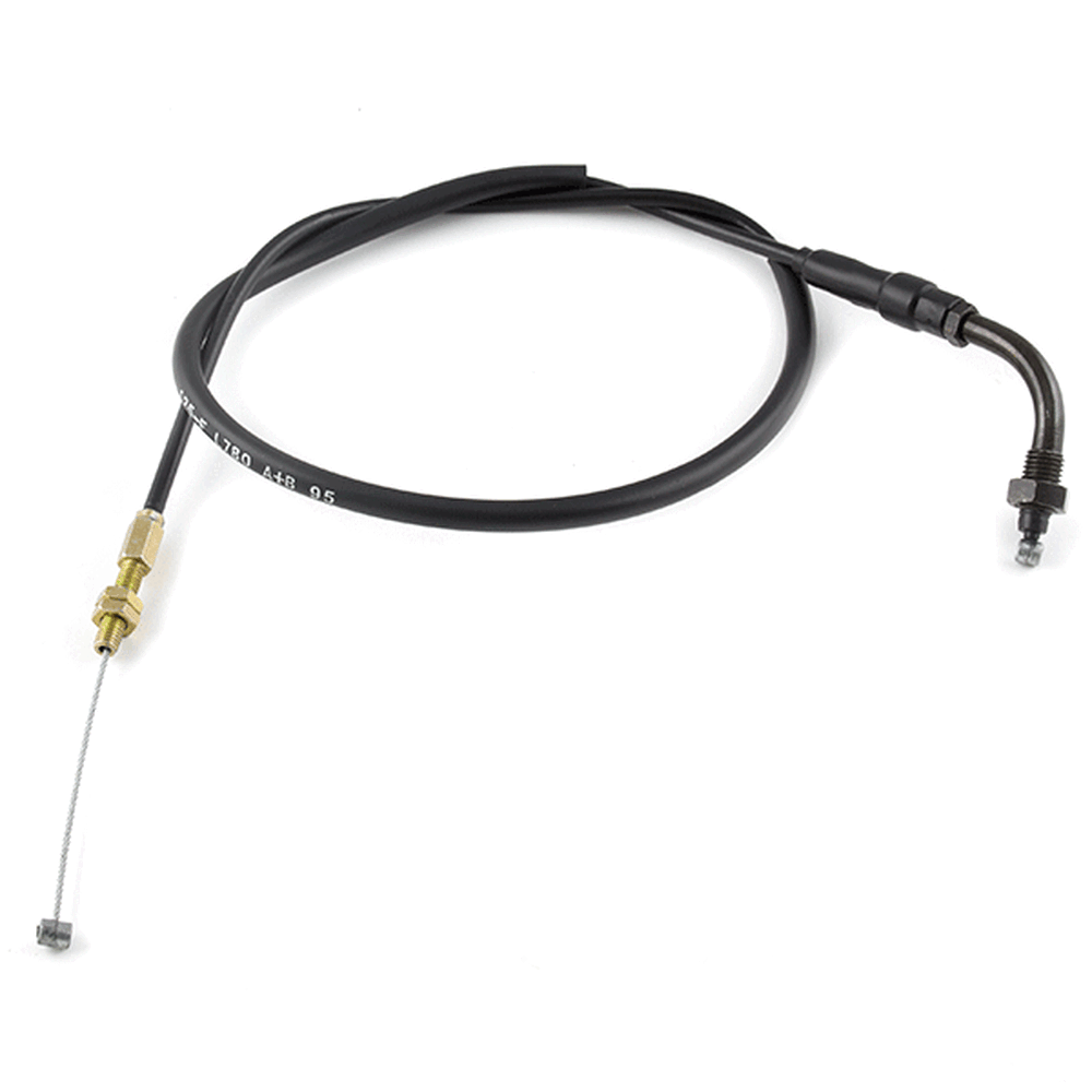 The throttle cable in a motorcycle is a flexible, wire-reinforced cable that connects the throttle grip to the throttle body or carburetor. It transmits the rider's input from twisting the throttle grip to the engine’s air intake system, allowing for precise control of engine power and acceleration. The throttle cable is designed to be durable and resistant to wear, providing smooth and reliable operation. Proper adjustment and maintenance of the throttle cable are essential for ensuring responsive throttle control and optimal engine performance.